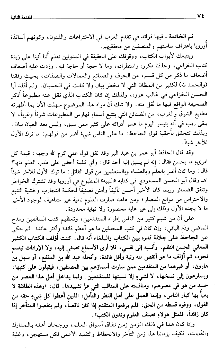 على أن من شيم كثير من الناس إطراء المتقدمين، وتعظيم كتب السالفين ومدح الماضي وذم الباقي، وإن كان في كتب المحدثين ما هو أعظم فائدة وأكثر عائدة. ثم حكي عن الجاحظ على جلالة قدره بين الكتاب والبلغاء أنه قال: كنت أؤلف الكتاب الكثير المعاني الحسن النظم، وأنسبه إلى نفسي، فلا أرى الأسماع تصغي إليه، ولا الإرادات تبتسم نحوه، ثم أؤلف ما هو أنقص منه رتبة وأقل فائدة، وأنحله عبد الله بن المقفع، أو سهل بن هارون، أو غيرهما من المتقدمين ممن سارت أسماؤهم بين المصنفين، فيقبلون على كتبها، ويسارعون إلى نسخها، لا لشيء إلا نسبتها للمتقدمين. ولما يداخل أهل هذا العصر من حسد من هو في عصرهم، ومنافسته على المناقب التي عزّ تشييدها. قال: «وهذه الطائفة لا يعبأ بها كبار الناس، وإنما العمل على أهل النظر والتأمل، الذين أعطوا كل شيء حقه من القول، ووفوه قسطه من الحق، فلم يرفعوا المتقدم إذا كان ناقصا، ولم ينقصوا المتأخر إذا كان زائدا، فلمثل هولاء تصنف العلوم وتدون الكتب» .
