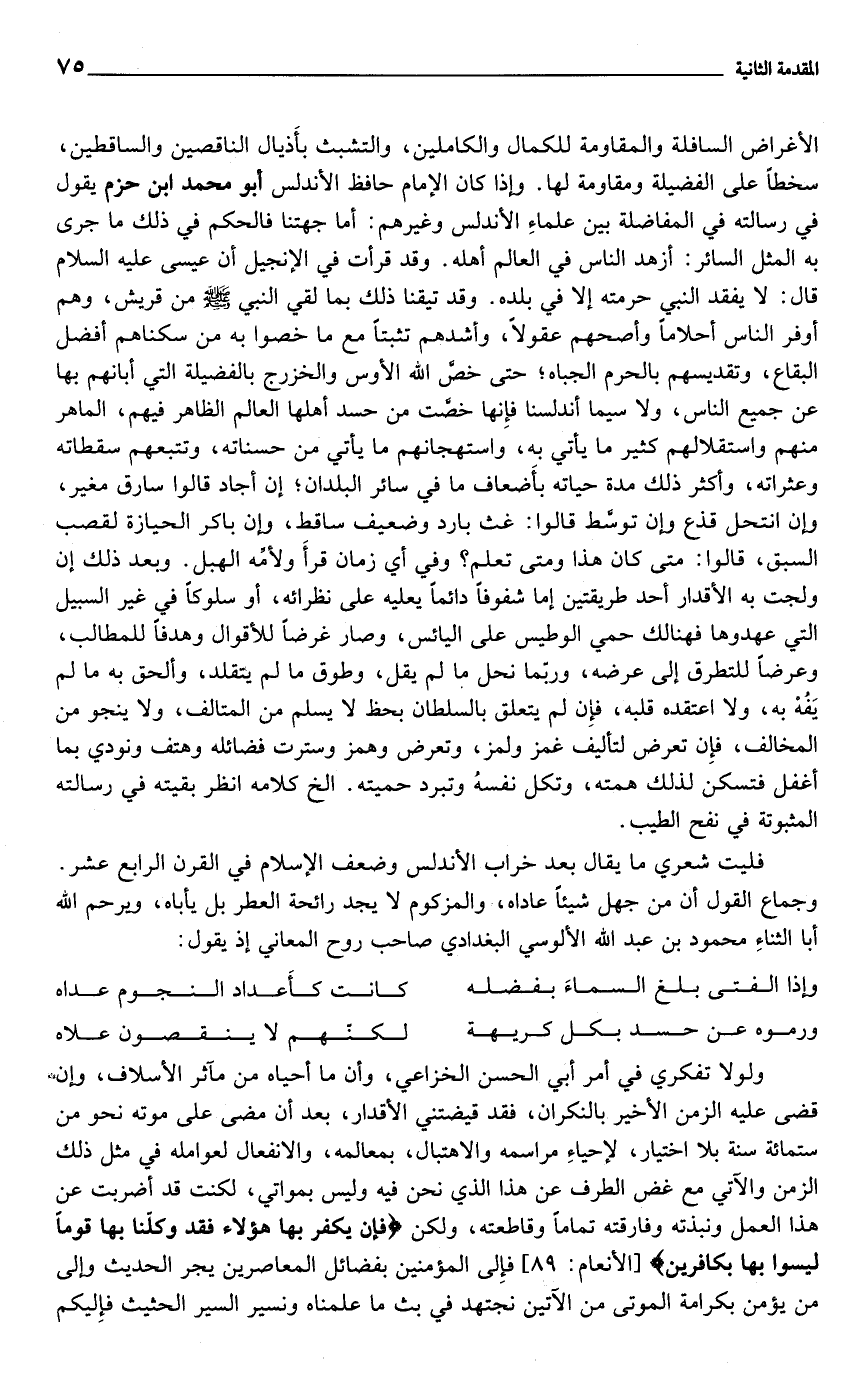 الأغراض السافلة والمقاومة للكمال والكاملين، والتشبث بأذيال الناقصين والساقطين، سخطا على الفضيلة ومقاومة لها. وإذا كان الإمام حافظ الأندلس أبو محمد ابن حزم يقول في رسالته في المفاضلة بين علماء الأندلس وغيرهم: أما جهتنا فالحكم في ذلك ما جرى به المثل السائر: أزهد الناس في العالم أهله. وقد قرأت في الإنجيل أن عيسى عليه السلام قال: لا يفقد النبي حرمته إلا في بلده. وقد تيقنا ذلك بما لقي النبي صلى الله عليه وسلم من قريش، وهم أوفر الناس أحلاما وأصحهم عقولا، وأشدهم تثبتا مع ما خصوا به من سكناهم أفضل البقاع، وتقديسهم بالحرم الجباه؛ حتى خصّ الله الأوس والخزرج بالفضيلة التي أبانهم بها عن جميع الناس، ولا سيما أندلسنا فإنها خصّت من حسد أهلها العالم الظاهر فيهم، الماهر منهم واستقلالهم كثير ما يأتي به، واستهجانهم ما يأتي من حسناته، وتتبعهم سقطاته وعثراته، وأكثر ذلك مدة حياته بأضعاف ما في سائر البلدان؛ إن أجاد قالوا سارق مغير، وإن انتحل قذع وإن توسّط قالوا: غث بارد وضعيف ساقط، وإن باكر الحيازة لقصب السبق، قالوا: متى كان هذا ومتى تعلم؟ وفي أي زمان قرأ ولأمّه الهبل. وبعد ذلك إن ولجت به الأقدار أحد طريقتين إما شفوفا دائما يعليه على نظرائه، أو سلوكا في غير السبيل التي عاهدوها فهنالك حمي الوطيس على اليائس، وصار غرضا للأقوال وهدفا للمطالب، وعرضا للتطرق إلى عرضه، وربّما نحل ما لم يقل، وطوق ما لم يتقلد، وألحق به ما لم يفه به، ولا اعتقده قلبه، فإن لم يتعلق بالسلطان بحظ لا يسلم من المتالف، ولا ينجو من المخالف، فإن تعرض لتأليف غمز ولمز، وتعرض وهمز وسترت فضائله وهتف ونودي بما أغفل فتسكن لذلك همته، وتكل نفسه وتبرد حميته. الخ كلامه انظر بقيته في رسالته المثبوتة في نفح الطيب.