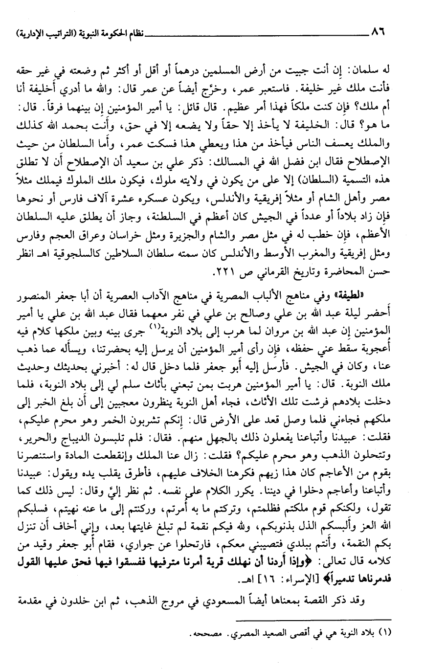 «لطيفة» وفي مناهج الألباب المصرية في مناهج الآداب العصرية أن أبا جعفر المنصور أحضر ليلة عبد الله بن علي وصالح بن علي في نفر معهما فقال عبد الله بن علي يا أمير المؤمنين إن عبد الله بن مروان لما هرب إلى بلاد النوبة «1» جرى بينه وبين ملكها كلام فيه أعجوبة سقط عني حفظه، فإن رأى أمير المؤمنين أن يرسل إليه بحضرتنا، ويسأله عما ذهب عنا، وكان في الجيش. فأرسل إليه أبو جعفر فلما دخل قال له: أخبرني بحديثك وحديث ملك النوبة. قال: يا أمير المؤمنين هربت بمن تبعني بأثاث سلم لي إلى بلاد النوبة، فلما دخلت بلادهم فرشت تلك الأثاث، فجاء أهل النوبة ينظرون معجبين إلى أن بلغ الخبر إلى ملكهم فجاءني فلما وصل قعد على الأرض قال: إنكم تشربون الخمر وهو محرم عليكم، فقلت: عبيدنا وأتباعنا يفعلون ذلك بالجهل منهم. فقال: فلم تلبسون الديباج والحرير، وتتحلون الذهب وهو محرم عليكم؟ فقلت: زال عنا الملك وإنقطعت المادة واستنصرنا بقوم من الأعاجم كان هذا زيهم فكرهنا الخلاف عليهم، فأطرق يقلب يده ويقول: عبيدنا وأتباعنا وأعاجم دخلوا في ديننا. يكرر الكلام على نفسه. ثم نظر إليّ وقال: ليس ذلك كما تقول، ولكنكم قوم ملكتم فظلمتم، وتركتم ما به أمرتم، وركنتم إلى ما عنه نهيتم، فسلبكم الله العز وألبسكم الذل بذنوبكم، ولله فيكم نقمة لم تبلغ غايتها بعد، وإني أخاف أن تنزل بكم النقمة، وأنتم ببلدي فتصيا بني معكم، فارتحلوا عن جواري، فقام أبو جعفر وقيد من كلامه قال تعالى: وَإِذا أَرَدْنا أَنْ نُهْلِكَ قَرْيَةً أَمَرْنا مُتْرَفِيها فَفَسَقُوا فِيها فَحَقَّ عَلَيْهَا الْقَوْلُ فَدَمَّرْناها تَدْمِيراً
