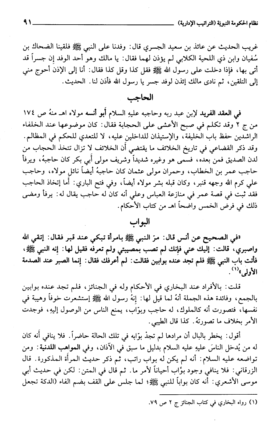في العقد الفريد لإبن عبد ربه وحاجبه عليه السلام أبو أنسه مولاه اهـ منه ص 174 من ج 2 وقد تكلم في صبح الأعشى على الحجابة فقال: كان موضوعها عند الخلفاء الراشدين حفظ باب الخليفة، والإستيذان للداخلين عليه، لا للتعدي للحكم في المظالم.