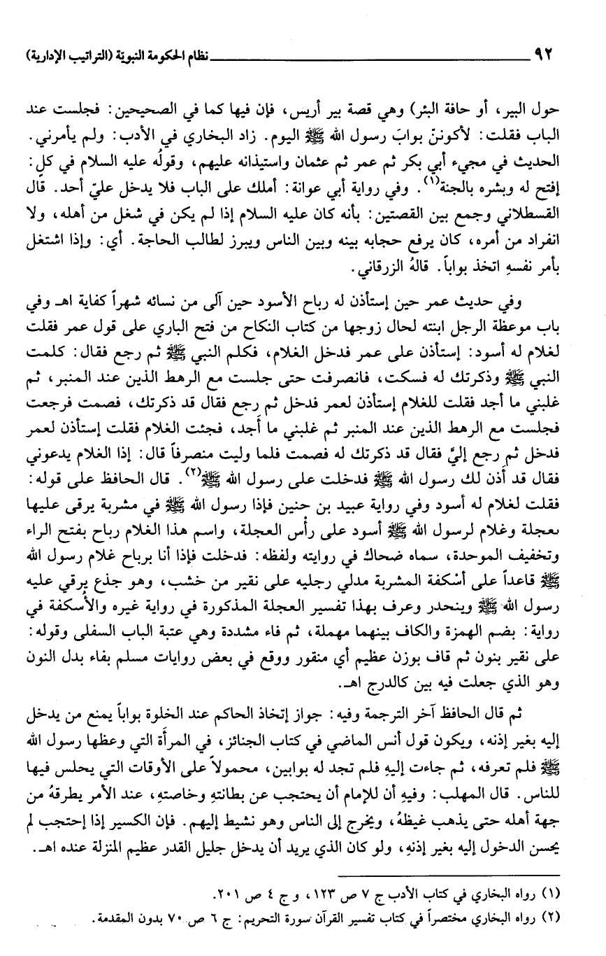 ثم قال الحافظ آخر الترجمة وفيه: جواز إتخاذ الحاكم عند الخلوة بوابا يمنع من يدخل إليه بغير إذنه، ويكون قول أنس الماضي في كتاب الجنائز، في المرأة التي وعظها رسول الله صلى الله عليه وسلم فلم تعرفه، ثم جاءت إليه فلم تجد له بوابين، محمولا على الأوقات التي يحلس فيها للناس. قال المهلب: وفيه أن للإمام أن يحتجب عن بطانته وخاصته، عند الأمر يطرقه من جهة أهله حتى يذهب غيظه، ويخرج إلى الناس وهو نشيط إليهم. فإن الكسير إذا إحتجب لم يحسن الدخول إليه بغير إذنه، ولو كان الذي يريد أن يدخل جليل القدر عظيم المنزلة عنده اهـ.