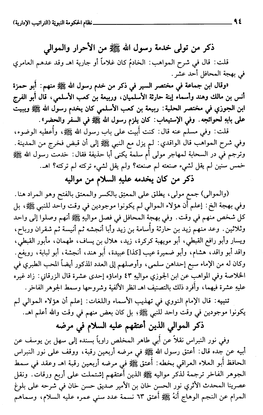 وفي بهجة الخ: إعلم أن هؤلاء الموالي لم يكونوا موجودين في وقت واحد للنبي صلى الله عليه وسلم، بل كل شخص منهم في وقت. وفي بهجة المحافل في فصل مواليه صلى الله عليه وسلم أنهم وصلوا إلى واحد وثلاثين. وعد منهم زيد بن حارثة وأسامة بن زيد وأبا أنجشه ثم أنيسة ثم شقران ورباح، ويسار وأبو رافع القبطي، أبو مويهبة كركرة، زيد، هلال بن يساف، طهمان، مأبور القبطي، واقد أبو واقد، هشام، وأبو ضميرة عيب [كذا] عبيدة، أبو هند، أنجشة، أبو لبابة، رويفع.
