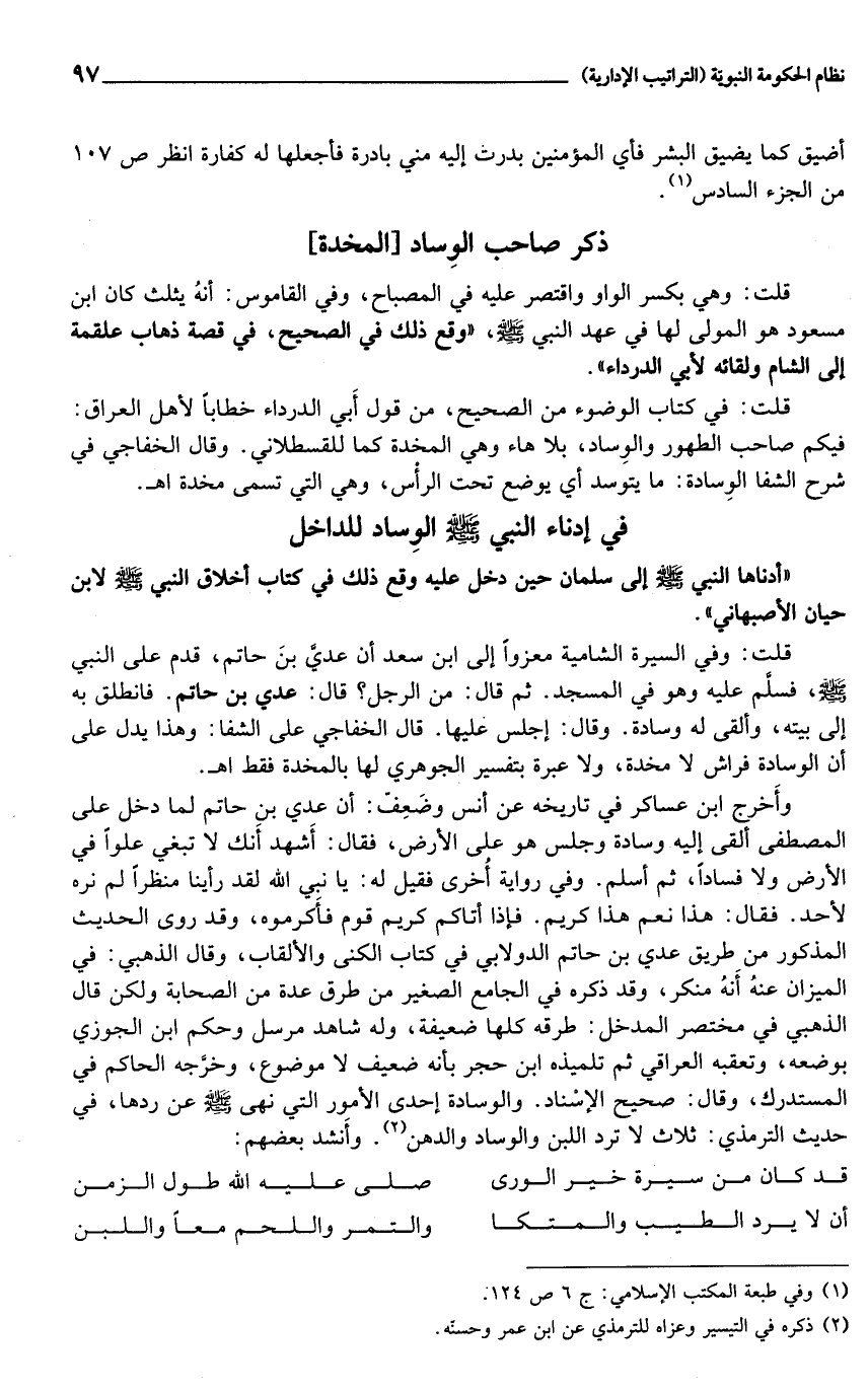 قلت: وفي السيرة الشامية معزوا إلى ابن سعد أن عديّ بن حاتم، قدم على النبي صلى الله عليه وسلم، فسلّم عليه وهو في المسجد. ثم قال: من الرجل؟ قال: عدي بن حاتم. فانطلق به إلى بيته، وألقى له وسادة. وقال: إجلس عليها. قال الخفاجي على الشفا: وهذا يدل على أن الوسادة فراش لا مخدة، ولا عبرة بتفسير الجوهري لها بالمخدة فقط اهـ.