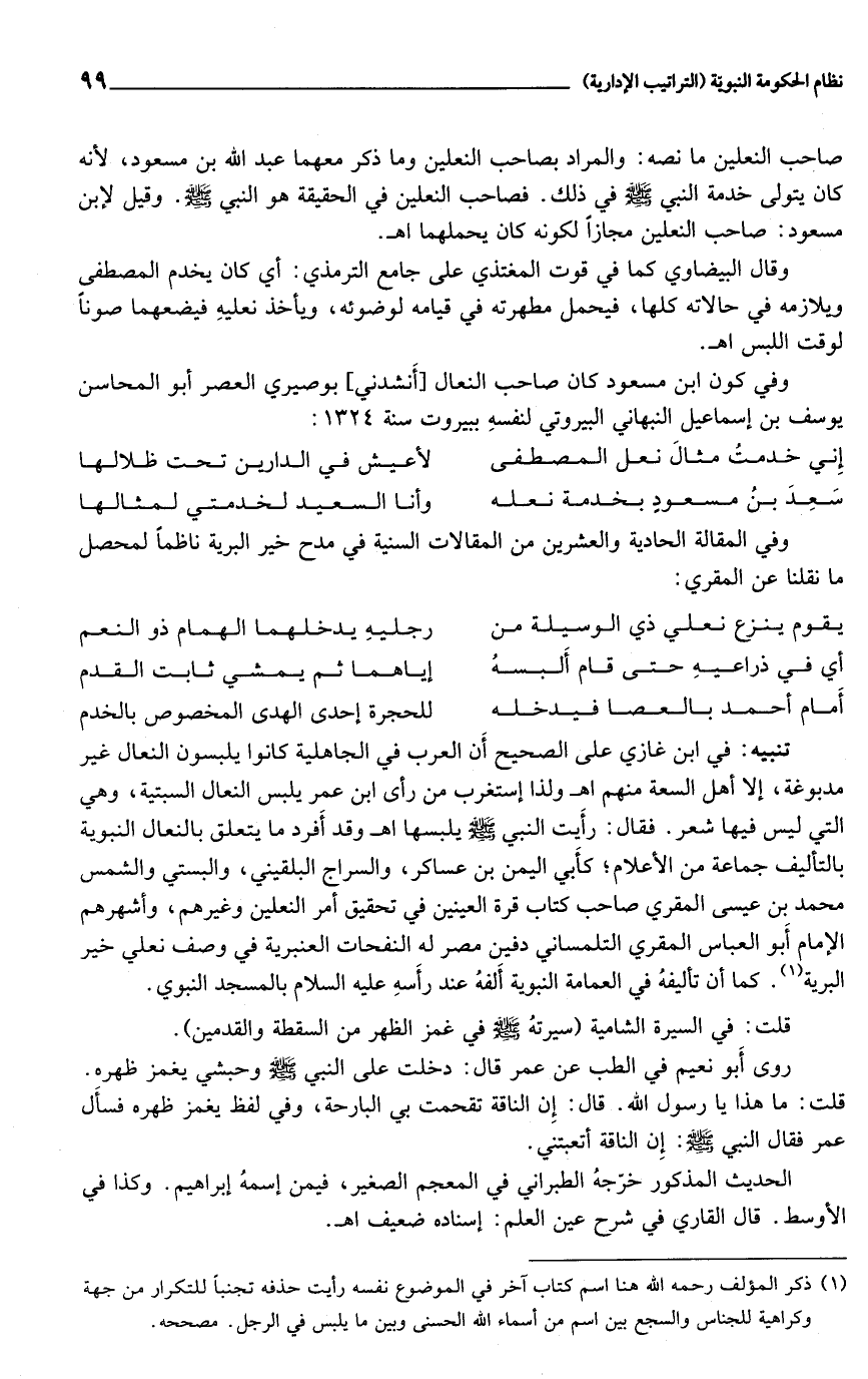وفي كون ابن مسعود كان صاحب النعال [أنشدني] بوصيري العصر أبو المحاسن يوسف بن إسماعيل النبهاني البيروتي لنفسه ببيروت سنة 1324: