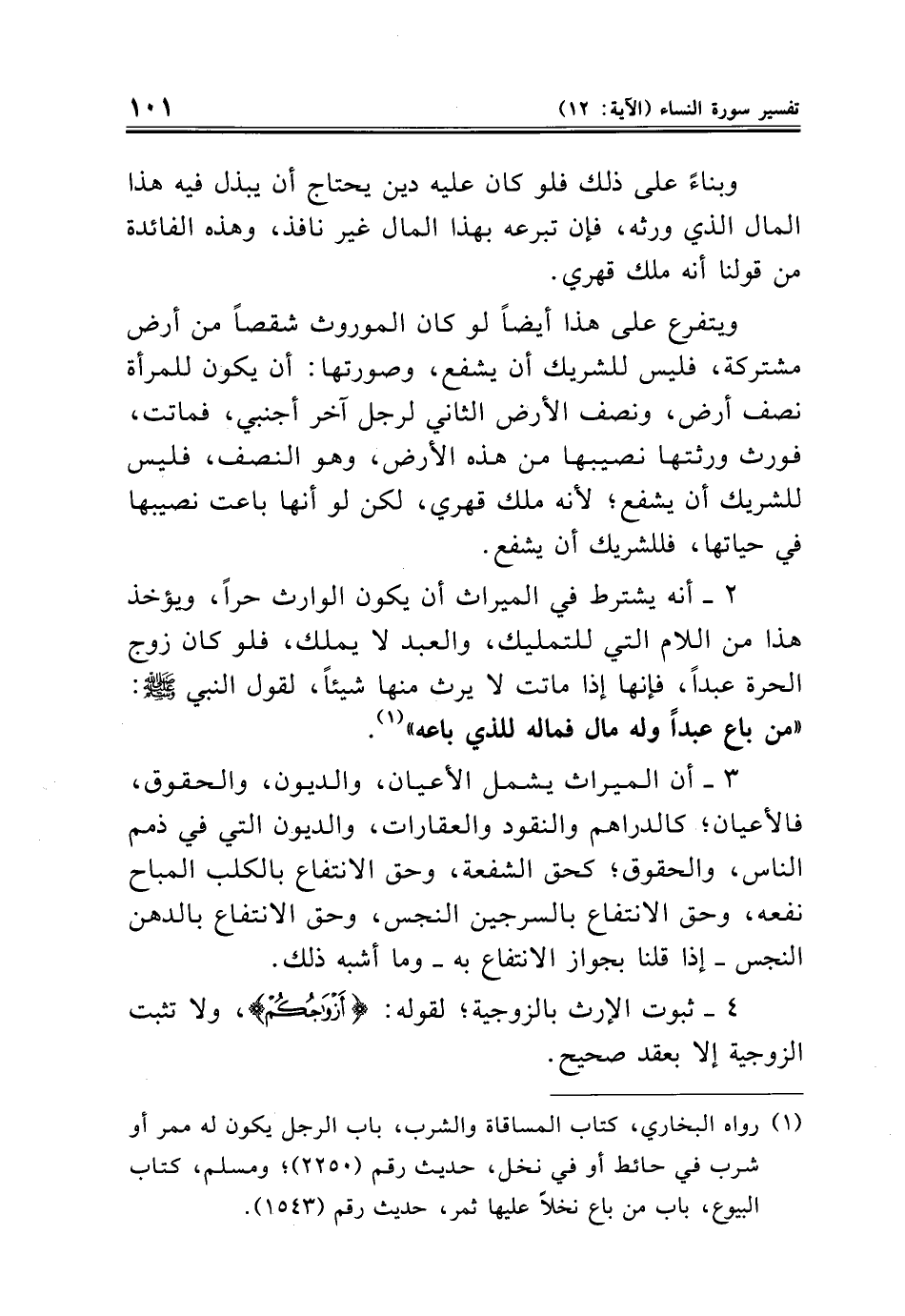 ٢ - أنه يشترط في الميراث أن يكون الوارث حرًا، ويؤخذ هذا من اللام التي للتمليك، والعبد لا يملك، فلو كان زوج الحرة عبدًا، فإنها إذا ماتت لا يرث منها شيئًا، لقول النبي - صلى الله عليه وسلم -: "من باع عبدًا وله مال فماله للذي باعه" (¬١).