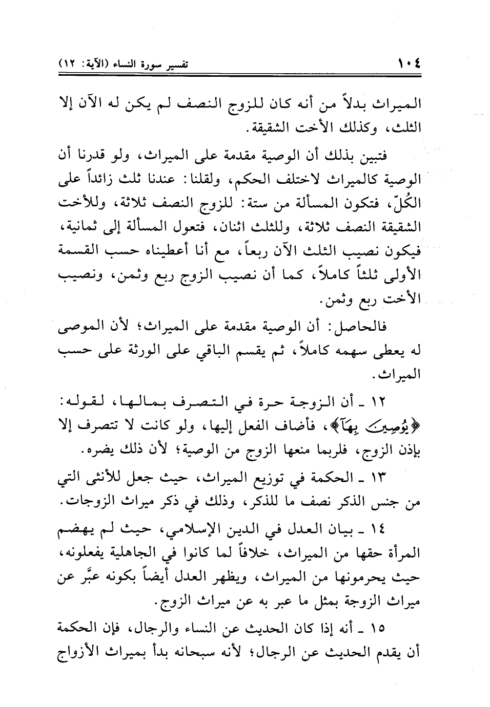 ١٤ - بيان العدل في الدين الإسلامي، حيث لم يهضم المرأة حقها من الميراث، خلافًا لما كانوا في الجاهلية يفعلونه، حيث يحرمونها من الميراث، ويظهر العدل أيضًا بكونه عبَّر عن ميراث الزوجة بمثل ما عبر به عن ميراث الزوج.