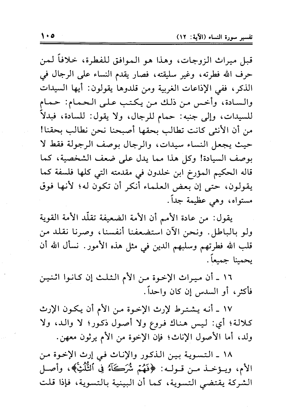 قبل ميراث الزوجات، وهذا هو الموافق للفطرة، خلافًا لمن حرف الله فطرته، وغير سليقته، فصار يقدم النساء على الرجال في الذكر، ففي الإذاعات الغربية ومن قلدوها يقولون: أيها السيدات والسادة، وأخس من ذلك من يكتب على الحمام: حمام للسيدات، وإلى جنبه: حمام للرجال، ولا يقول: للسادة، فبدلًا من أن الأنثى كانت تطالب بحقها أصبحنا نحن نطالب بحقنا! حيث يجعل النساء سيدات، والرجال بوصف الرجولة فقط لا بوصف السيادة! وكل هذا مما يدل على ضعف الشخصية، كما قاله الحكيم المؤرخ ابن خلدون في مقدمته التي كلها فلسفة كما يقولون، حتى إن بعض العلماء أنكر أن تكون له؛ لأنها فوق مستواه، وهي عظيمة جدًا.
