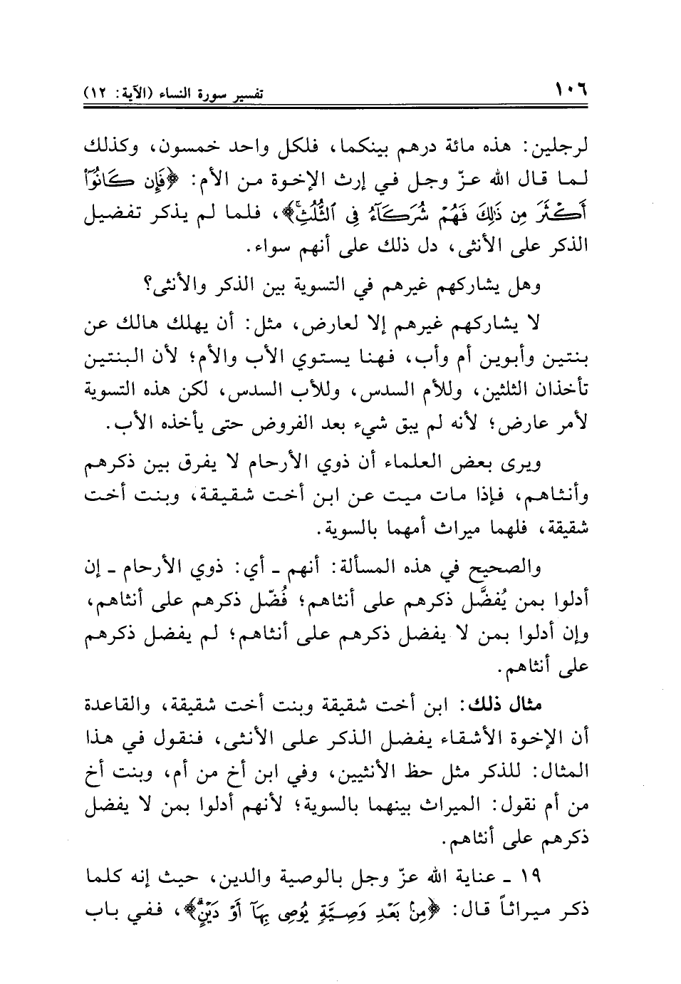 مثال ذلك: ابن أخت شقيقة وبنت أخت شقيقة، والقاعدة أن الإخوة الأشقاء يفضل الذكر على الأنثى، فنقول في هذا المثال: للذكر مثل حظ الأنثيين، وفي ابن أخ من أم، وبنت أخ من أم نقول: الميراث بينهما بالسوية؛ لأنهم أدلوا بمن لا يفضل ذكرهم على أنثاهم.