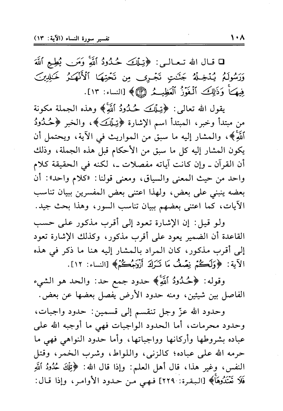 يقول الله تعالى: {تِلْكَ حُدُودُ اللَّهِ} وهذه الجملة مكونة من مبتدأ وخبر، المبتدأ اسم الإشارة {تِلْكَ}، والخبر {حُدُودُ اللَّهِ}، والمشار إليه ما سبق من المواريث في الآية، ويحتمل أن يكون المشار إليه كل ما سبق من الأحكام قبل هذه الجملة، وذلك أن القرآن - وإن كانت آياته مفصلات -، لكنه في الحقيقة كلام واحد من حيث المعنى والسياق، ومعنى قولنا: "كلام واحد": أن بعضه ينبني على بعض، ولهذا اعتنى بعض المفسرين ببيان تناسب الآيات، كما اعتنى بعضهم ببيان تناسب السور، وهذا بحث جيد.