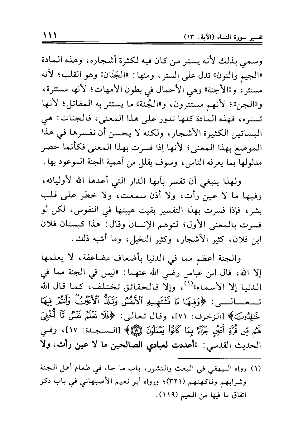 ولهذا ينبغي أن تفسر بأنها الدار التي أعدها الله لأوليائه، وفيها ما لا عين رأت، ولا أذن سمعت، ولا خطر على قلب بشر، فإذا فسرت بهذا التفسير بقيت هيبتها في النفوس، لكن لو فسرت بالمعنى الأول؛ لتوهم الإنسان وقال: هذا كبستان فلان ابن فلان، كثير الأشجار، وكثير النخيل، وما أشبه ذلك.