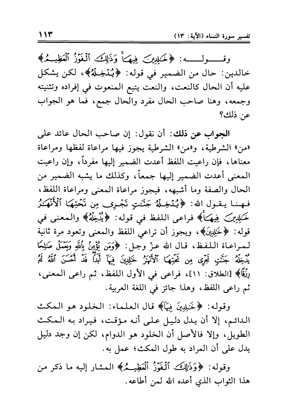 وقوله: {خَالِدِينَ فِيهَا وَذَلِكَ الْفَوْزُ الْعَظِيمُ} خالدين: حال من الضمير في قوله: {يُدْخِلْهُ}، لكن يشكل عليه أن الحال كالنعت، والنعت يتبع المنعوت في إفراده وتثنيته وجمعه، وهنا صاحب الحال مفرد والحال جمع، فما هو الجواب عن ذلك؟
