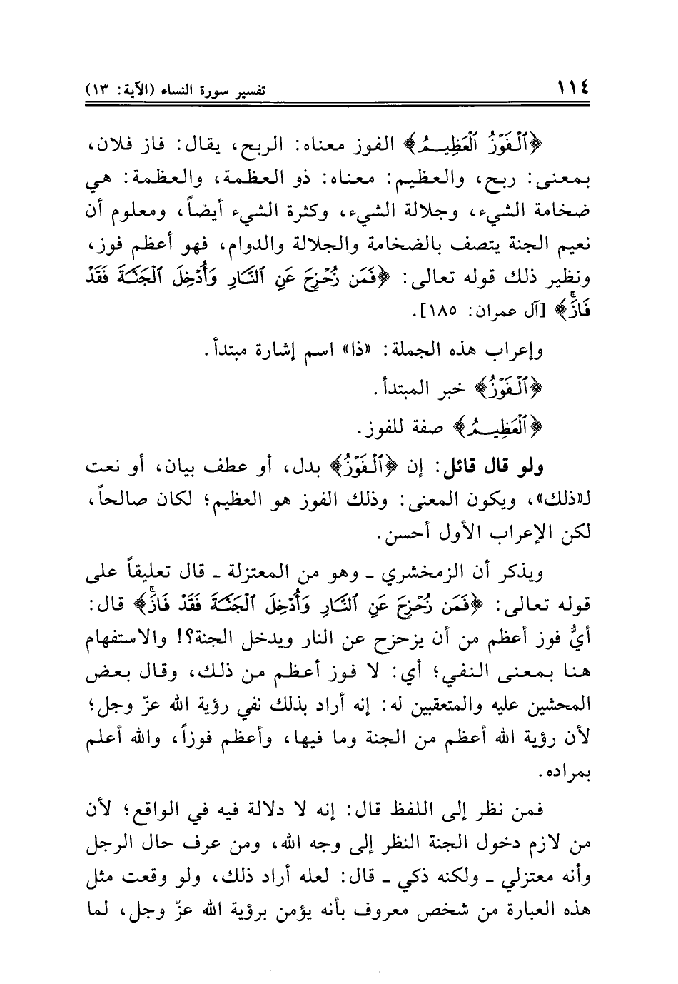 ولو قال قائل: إن {الْفَوْزُ} بدل، أو عطف بيان، أو نعت لـ "ذلك"، ويكون المعنى: وذلك الفوز هو العظيم؛ لكان صالحًا، لكن الإعراب الأول أحسن.