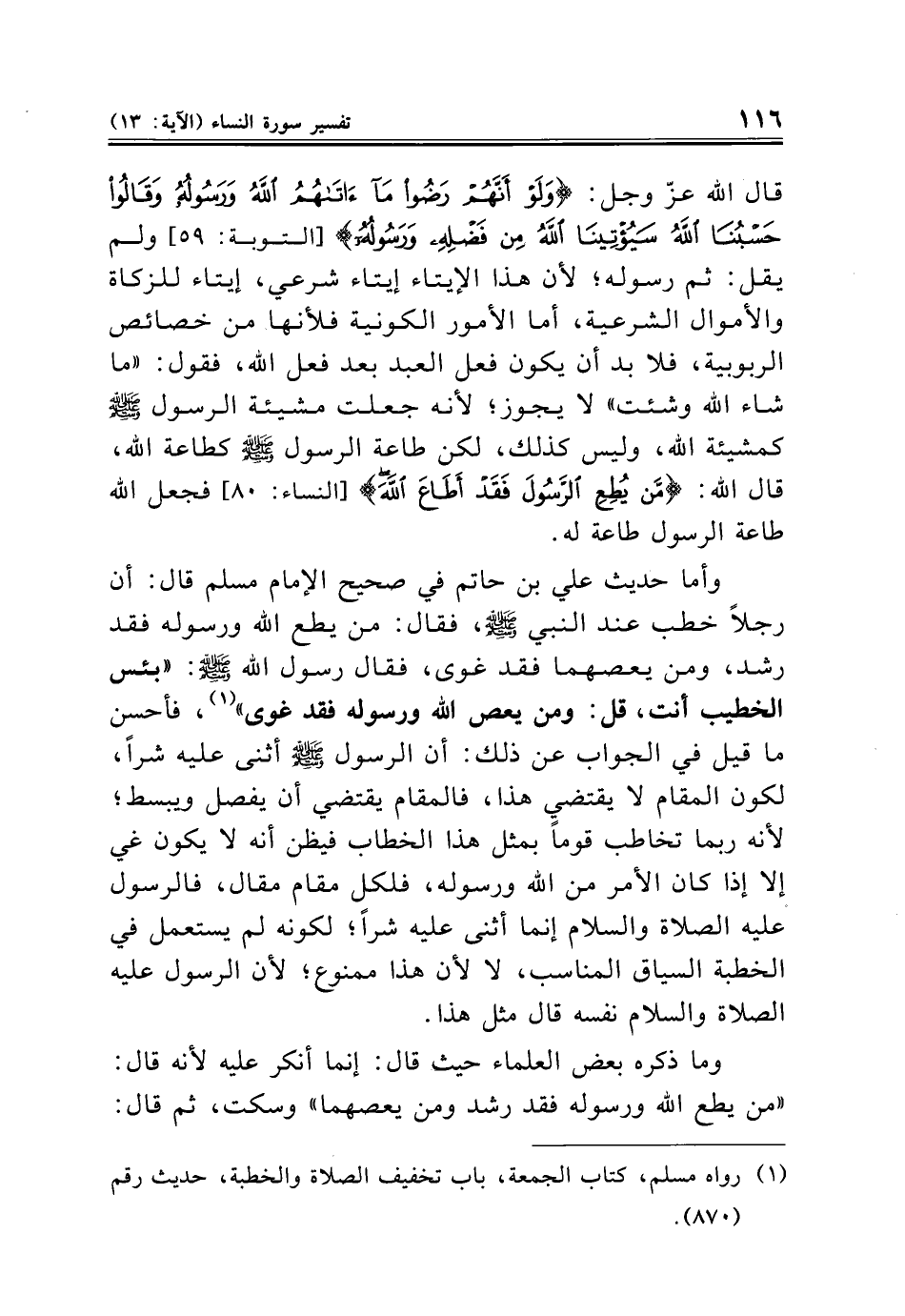 قال الله عزّ وجل: {وَلَوْ أَنَّهُمْ رَضُوا مَا آتَاهُمُ اللَّهُ وَرَسُولُهُ وَقَالُوا حَسْبُنَا اللَّهُ سَيُؤْتِينَا اللَّهُ مِنْ فَضْلِهِ وَرَسُولُهُ} [التوبة: ٥٩] ولم يقل: ثم رسوله؛ لأن هذا الإيتاء إيتاء شرعي، إيتاء للزكاة والأموال الشرعية، أما الأمور الكونية فلأنها من خصائص الربوبية، فلا بد أن يكون فعل العبد بعد فعل الله، فقول: "ما شاء الله وشئت" لا يجوز؛ لأنه جعلت مشيئة الرسول - صلى الله عليه وسلم - كمشيئة الله، وليس كذلك، لكن طاعة الرسول - صلى الله عليه وسلم - كطاعة الله، قال الله: {مَنْ يُطِعِ الرَّسُولَ فَقَدْ أَطَاعَ اللَّهَ} [النساء: ٨٠] فجعل الله طاعة الرسول طاعة له.