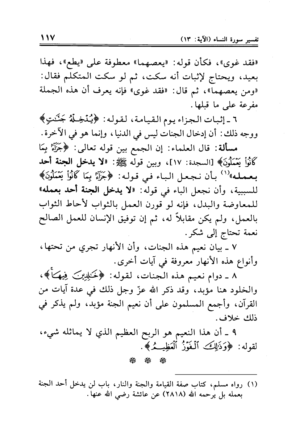مسألة: قال العلماء: إن الجمع بين قوله تعالى: {جَزَاءً بِمَا كَانُوا يَعْمَلُونَ} [السجدة: ١٧]، وبين قوله - صلى الله عليه وسلم -: "لا يدخل الجنة أحد بعمله" (¬١) بأن نجعل الباء في قوله: {جَزَاءً بِمَا كَانُوا يَعْمَلُونَ} للسببية، وأن نجعل الباء في قوله: "لا يدخل الجنة أحد بعمله" للمعاوضة والبدل، فإنه لو قورن العمل بالثواب لأحاط الثواب بالعمل، ولم يكن مقابلًا له، ثم إن توفيق الإنسان للعمل الصالح نعمة تحتاج إلى شكر.
