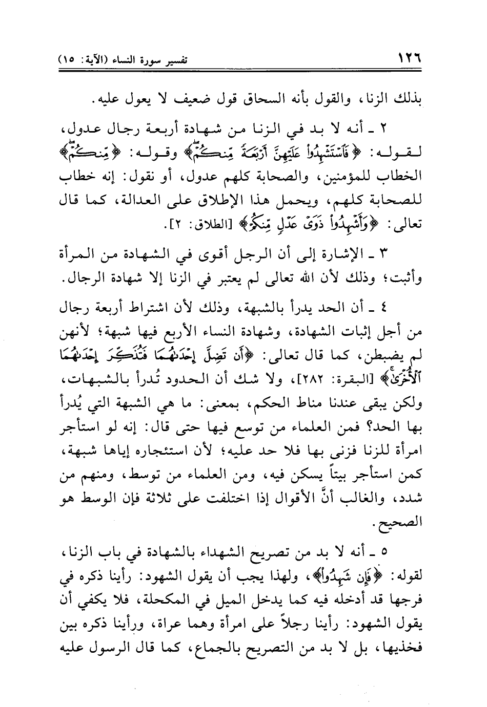 ٢ - أنه لا بد في الزنا من شهادة أربعة رجال عدول، لقوله: {فَاسْتَشْهِدُوا عَلَيْهِنَّ أَرْبَعَةً مِنْكُمْ} وقوله: {مِنْكُمْ} الخطاب للمؤمنين، والصحابة كلهم عدول، أو نقول: إنه خطاب للصحابة كلهم، ويحمل هذا الإطلاق على العدالة، كما قال تعالى: {وَأَشْهِدُوا ذَوَيْ عَدْلٍ مِنْكُمْ} [الطلاق: ٢].
