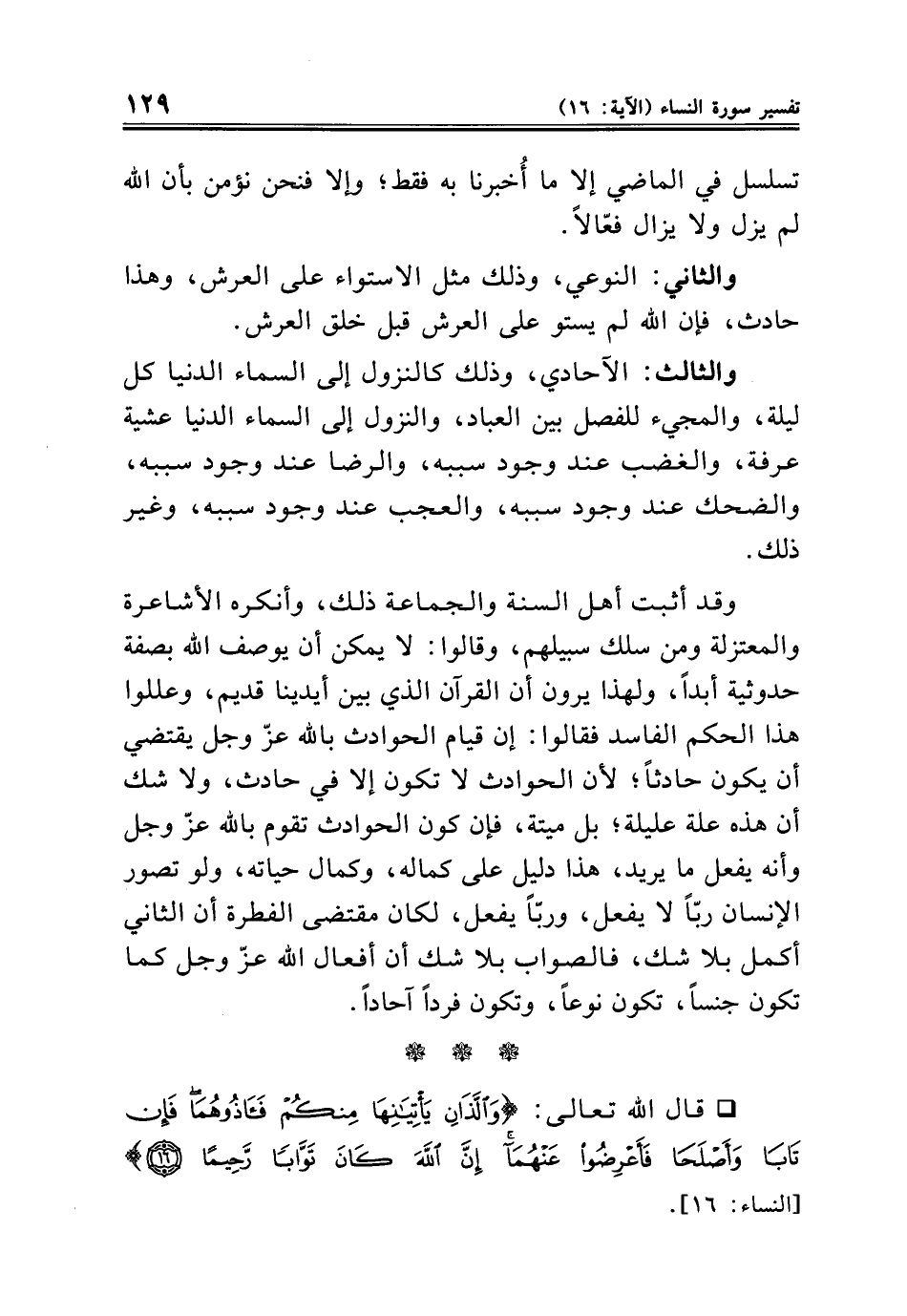 وقد أثبت أهل السنة والجماعة ذلك، وأنكره الأشاعرة والمعتزلة ومن سلك سبيلهم، وقالوا: لا يمكن أن يوصف الله بصفة حدوثية أبدًا، ولهذا يرون أن القرآن الذي بين أيدينا قديم، وعللوا هذا الحكم الفاسد فقالوا: إن قيام الحوادث بالله عزّ وجل يقتضي أن يكون حادثًا؛ لأن الحوادث لا تكون إلا في حادث، ولا شك أن هذه علة عليلة؛ بل ميتة، فإن كون الحوادث تقوم بالله عزّ وجل وأنه يفعل ما يريد، هذا دليل على كماله، وكمال حياته، ولو تصور الإنسان ربًّا لا يفعل، وربًّا يفعل، لكان مقتضى الفطرة أن الثاني أكمل بلا شك، فالصواب بلا شك أن أفعال الله عزّ وجل كما تكون جنسًا، تكون نوعًا، وتكون فردًا آحادًا.