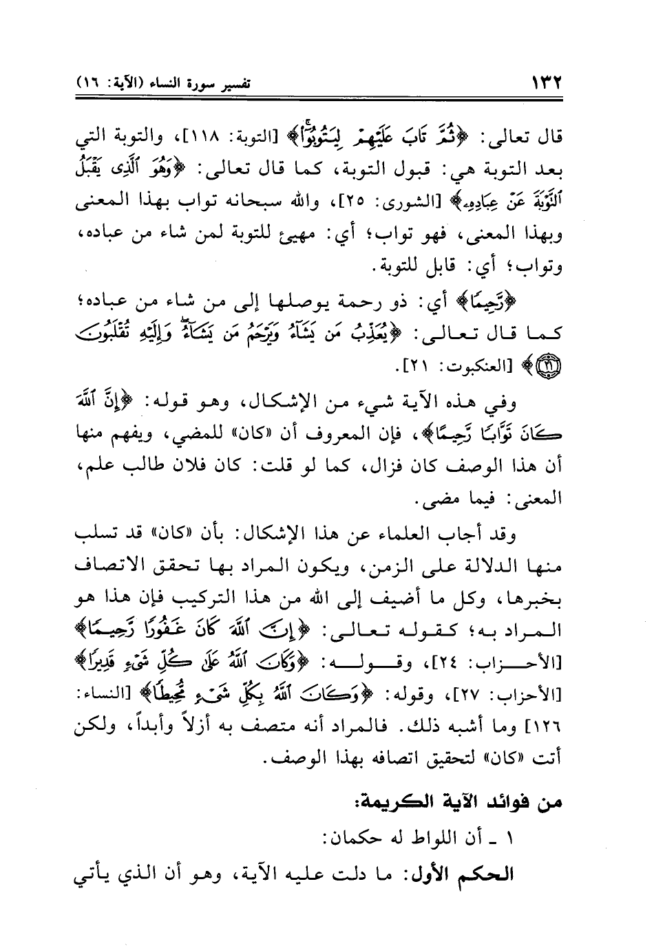 وفي هذه الآية شيء من الإشكال، وهو قوله: {إِنَّ اللَّهَ كَانَ تَوَّابًا رَحِيمًا}، فإن المعروف أن "كان" للمضي، ويفهم منها أن هذا الوصف كان فزال، كما لو قلت: كان فلان طالب علم، المعنى: فيما مضى.