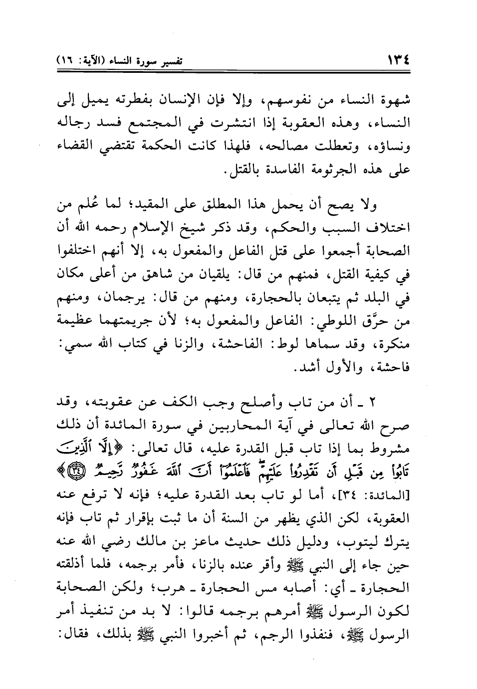 ٢ - أن من تاب وأصلح وجب الكف عن عقوبته، وقد صرح الله تعالى في آية المحاربين في سورة المائدة أن ذلك مشروط بما إذا تاب قبل القدرة عليه، قال تعالى: {إِلَّا الَّذِينَ تَابُوا مِنْ قَبْلِ أَنْ تَقْدِرُوا عَلَيْهِمْ فَاعْلَمُوا أَنَّ اللَّهَ غَفُورٌ رَحِيمٌ (٣٤)} [المائدة: ٣٤]، أما لو تاب بعد القدرة عليه؛ فإنه لا ترفع عنه العقوبة، لكن الذي يظهر من السنة أن ما ثبت بإقرار ثم تاب فإنه يترك ليتوب، ودليل ذلك حديث ماعز بن مالك - رضي الله عنه - حين جاء إلى النبي - صلى الله عليه وسلم - وأقر عنده بالزنا، فأمر برجمه، فلما أذلقته الحجارة - أي: أصابه مس الحجارة - هرب؛ ولكن الصحابة لكون الرسول - صلى الله عليه وسلم - أمرهم برجمه قالوا: لا بد من تنفيذ أمر الرسول - صلى الله عليه وسلم -، فنفذوا الرجم، ثم أخبروا النبي - صلى الله عليه وسلم - بذلك، فقال: