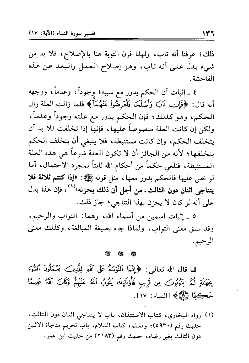 ٤ - إثبات أن الحكم يدور مع سببه؛ وجودًا، وعدمًا، ووجهه أنه قال: {فَإِنْ تَابَا وَأَصْلَحَا فَأَعْرِضُوا عَنْهُمَا} فلما زالت العلة زال الحكم، وهو كذلك؛ فإن الحكم يدور مع علته وجودًا وعدمًا، ولكن إن كانت العلة منصوصًا عليها، فإنها إذا تخلفت فلا بد أن يتخلف الحكم، وإن كانت مستنبطة، فلا ينبغي أن يتخلف الحكم بتخلفها؛ لأنه من الجائز أن لا تكون العلة شرعًا هي هذه العلة المستنبطة، فنلغي حكمًا من أحكام الله ثابتًا بمجرد الإحتمال، أما لو نص عليها فالحكم يدور معها، مثل قوله - صلى الله عليه وسلم -: "إذا كنتم ثلاثة فلا يتناجى اثنان دون الثالث، من أجل أن ذلك يحزنه" (¬١)، فإن هذا يدل على أنه لو كان لا يحزن بهذا التناجي؛ جاز ذلك.
