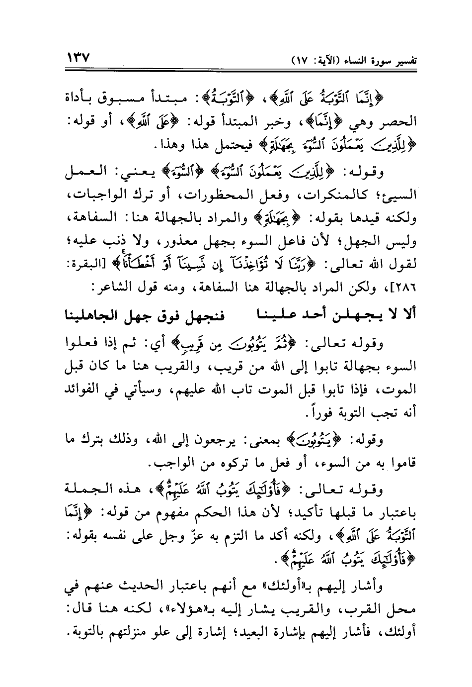 {إِنَّمَا التَّوْبَةُ عَلَى اللَّهِ}، {التَّوْبَةُ}: مبتدأ مسبوق بأداة الحصر وهي {إِنَّمَا}، وخبر المبتدأ قوله: {عَلَى اللَّهِ}، أو قوله: {لِلَّذِينَ يَعْمَلُونَ السُّوءَ بِجَهَالَةٍ} فيحتمل هذا وهذا.
