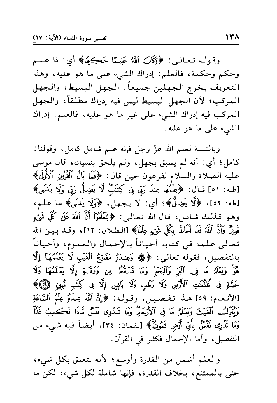 وبالنسبة لعلم الله عزّ وجل فإنه علم شامل كامل، وقولنا: كامل؛ أي: أنه لم يسبق بجهل، ولم يلحق بنسيان، قال موسى عليه الصلاة والسلام لفرعون حين قال: {فَمَا بَالُ الْقُرُونِ الْأُولَى} [طه: ٥١] قال: {عِلْمُهَا عِنْدَ رَبِّي فِي كِتَابٍ لَا يَضِلُّ رَبِّي وَلَا يَنْسَى} [طه: ٥٢]، {لَا يَضِلُّ}؛ أي: لا يجهل، {وَلَا يَنْسَى} ما علم، وهو كذلك شامل، قال الله تعالى: {لِتَعْلَمُوا أَنَّ اللَّهَ عَلَى كُلِّ شَيْءٍ قَدِيرٌ وَأَنَّ اللَّهَ قَدْ أَحَاطَ بِكُلِّ شَيْءٍ عِلْمًا} [الطلاق: ١٢]، وقد بين الله تعالى علمه في كتابه أحيانًا بالإجمال والعموم، وأحيانًا بالتفصيل، فقوله تعالى: {وَعِنْدَهُ مَفَاتِحُ الْغَيْبِ لَا يَعْلَمُهَا إِلَّا هُوَ وَيَعْلَمُ مَا فِي الْبَرِّ وَالْبَحْرِ وَمَا تَسْقُطُ مِنْ وَرَقَةٍ إِلَّا يَعْلَمُهَا وَلَا حَبَّةٍ فِي ظُلُمَاتِ الْأَرْضِ وَلَا رَطْبٍ وَلَا يَابِسٍ إِلَّا فِي كِتَابٍ مُبِينٍ (٥٩)} [الأنعام: ٥٩] هذا تفصيل، وقوله: {إِنَّ اللَّهَ عِنْدَهُ عِلْمُ السَّاعَةِ وَيُنَزِّلُ الْغَيْثَ وَيَعْلَمُ مَا فِي الْأَرْحَامِ وَمَا تَدْرِي نَفْسٌ مَاذَا تَكْسِبُ غَدًا وَمَا تَدْرِي نَفْسٌ بِأَيِّ أَرْضٍ تَمُوتُ} [لقمان: ٣٤]، أيضًا فيه شيء من التفصيل، وأما الإجمال فكثير في القرآن.