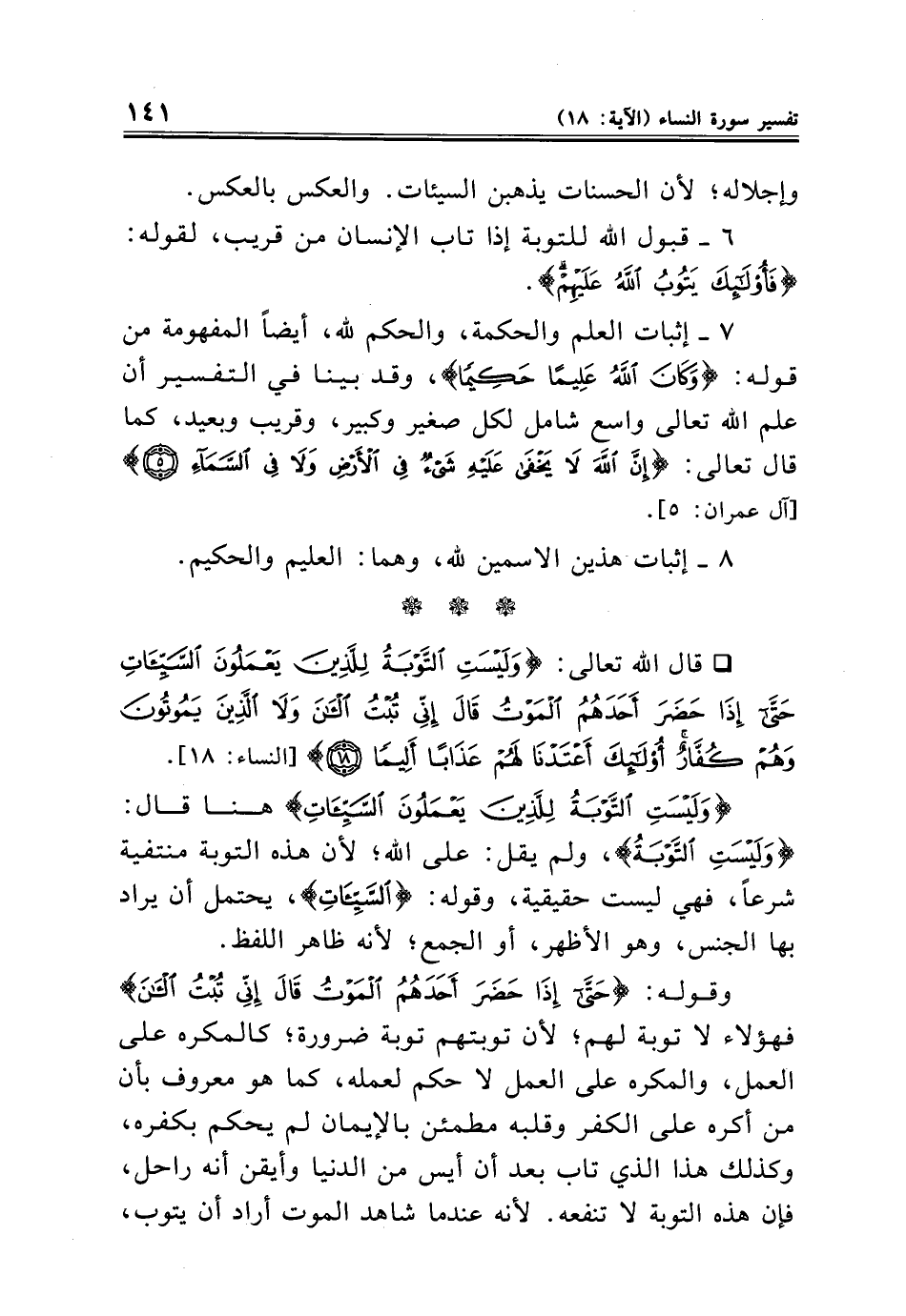 {وَلَيْسَتِ التَّوْبَةُ لِلَّذِينَ يَعْمَلُونَ السَّيِّئَاتِ} هنا قال: {وَلَيْسَتِ التَّوْبَةُ}، ولم يقل: على الله؛ لأن هذه التوبة منتفية شرعًا، فهي ليست حقيقية، وقوله: {السَّيِّئَاتِ}، يحتمل أن يراد بها الجنس، وهو الأظهر، أو الجمع؛ لأنه ظاهر اللفظ.