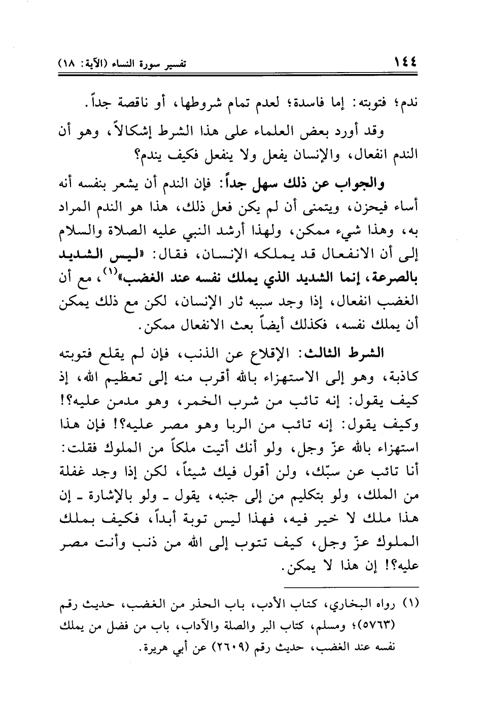 والجواب عن ذلك سهل جدًا: فإن الندم أن يشعر بنفسه أنه أساء فيحزن، ويتمنى أن لم يكن فعل ذلك، هذا هو الندم المراد به، وهذا شيء ممكن، ولهذا أرشد النبي عليه الصلاة والسلام إلى أن الإنفعال قد يملكه الإنسان، فقال: "ليس الشديد بالصرعة، إنما الشديد الذي يملك نفسه عند الغضب" (¬١)، مع أن الغضب انفعال، إذا وجد سببه ثار الإنسان، لكن مع ذلك يمكن أن يملك نفسه، فكذلك أيضًا بعث الإنفعال ممكن.