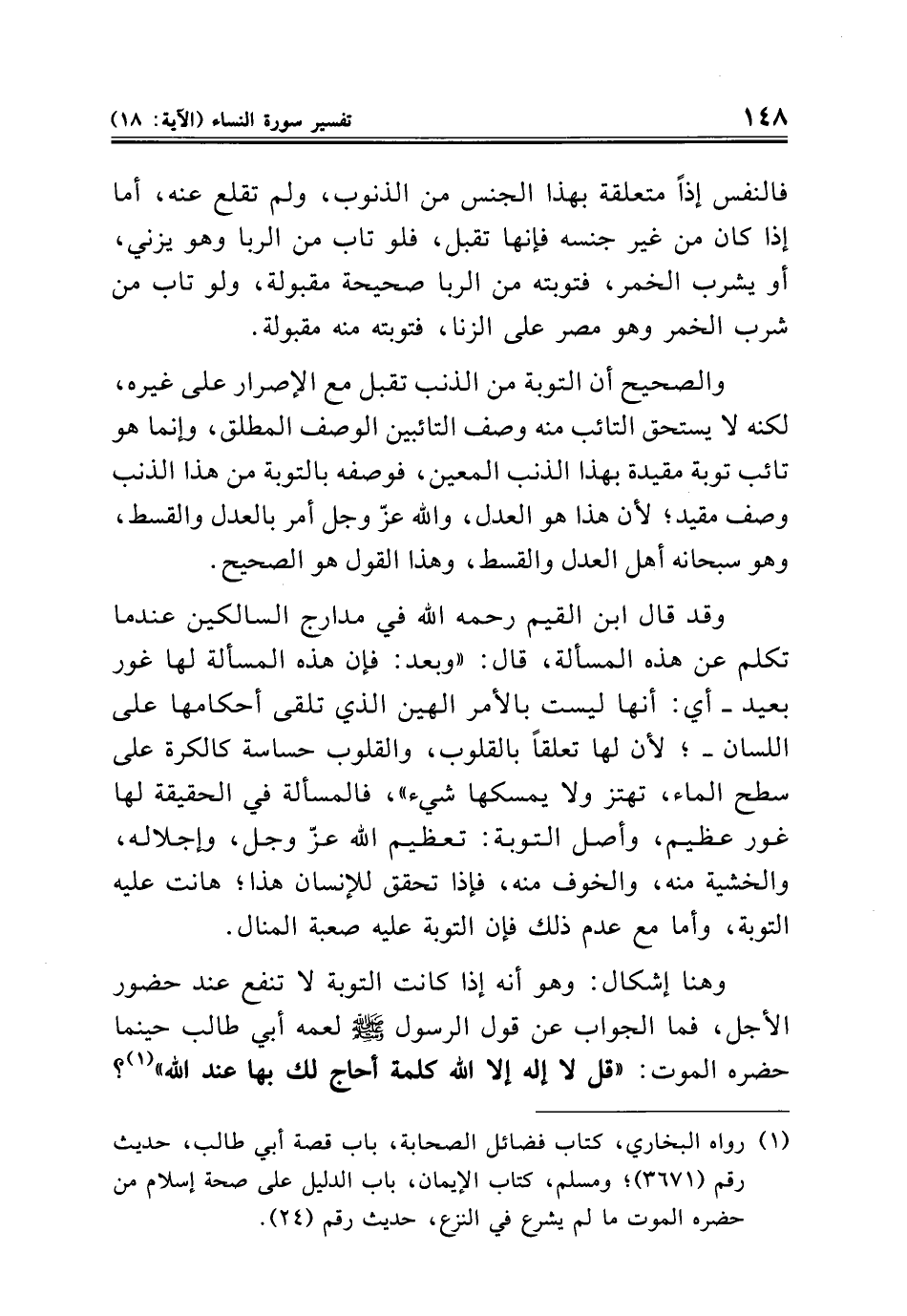 فالنفس إذًا متعلقة بهذا الجنس من الذنوب، ولم تقلع عنه، أما إذا كان من غير جنسه فإنها تقبل، فلو تاب من الربا وهو يزني، أو يشرب الخمر، فتوبته من الربا صحيحة مقبولة، ولو تاب من شرب الخمر وهو مصر على الزنا، فتوبته منه مقبولة.