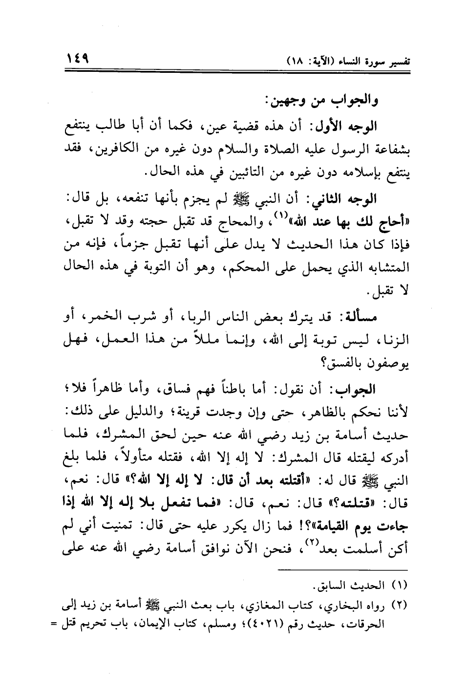 الوجه الثاني: أن النبي - صلى الله عليه وسلم - لم يجزم بأنها تنفعه، بل قال: "أحاج لك بها عند الله" (¬١)، والمحاج قد تقبل حجته وقد لا تقبل، فإذا كان هذا الحديث لا يدل على أنها تقبل جزمًا، فإنه من المتشابه الذي يحمل على المحكم، وهو أن التوبة في هذه الحال لا تقبل.