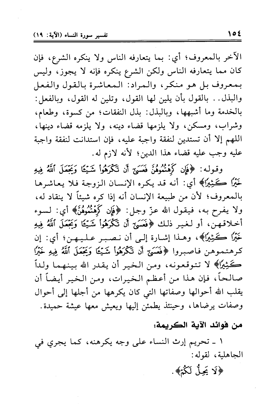 وقوله: {فَإِنْ كَرِهْتُمُوهُنَّ فَعَسَى أَنْ تَكْرَهُوا شَيْئًا وَيَجْعَلَ اللَّهُ فِيهِ خَيْرًا كَثِيرًا} أي: أنه قد يكره الإنسان الزوجة فلا يعاشرها بالمعروف؛ لأن من طبيعة الإنسان أنه إذا كره شيئًا لا ينقاد له، ولا يفرح به، فيقول الله عزّ وجل: {فَإِنْ كَرِهْتُمُوهُنَّ} أي: لسوء أخلاقهن، أو لغير ذلك {فَعَسَى أَنْ تَكْرَهُوا شَيْئًا وَيَجْعَلَ اللَّهُ فِيهِ خَيْرًا كَثِيرًا}، وهذا إشارة إلى أن نصبر عليهن؛ أي: إن كرهتموهن فاصبروا {فَعَسَى أَنْ تَكْرَهُوا شَيْئًا وَيَجْعَلَ اللَّهُ فِيهِ خَيْرًا كَثِيرًا} لا تتوقعونه، ومن الخير أن يقدر الله بينهما ولدًا صالحًا، فإن هذا من أعظم الخيرات، ومن الخير أيضًا أن يقلب الله أحوالها وصفاتها التي كان يكرهها من أجلها إلى أحوال وصفات يرضاها، وحينئذ يطمئن إليها ويعيش معها عيشة حميدة.
