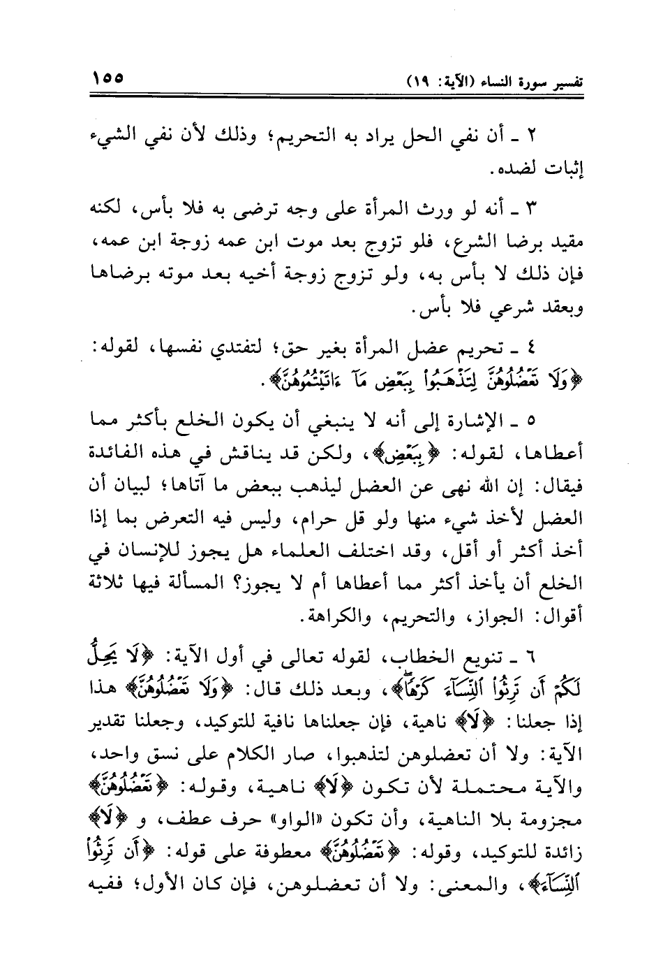 ٦ - تنويع الخطاب، لقوله تعالى في أول الآية: {لَا يَحِلُّ لَكُمْ أَنْ تَرِثُوا النِّسَاءَ كَرْهًا}، وبعد ذلك قال: {وَلَا تَعْضُلُوهُنَّ} هذا إذا جعلنا: {لَا} ناهية، فإن جعلناها نافية للتوكيد، وجعلنا تقدير الآية: ولا أن تعضلوهن لتذهبوا، صار الكلام على نسق واحد، والآية محتملة لأن تكون {لَا} ناهية، وقوله: {تَعْضُلُوهُنَّ} مجزومة بلا الناهية، وأن تكون "الواو" حرف عطف، و {لَا} زائدة للتوكيد، وقوله: {تَعْضُلُوهُنَّ} معطوفة على قوله: {أَنْ تَرِثُوا النِّسَاءَ}، والمعنى: ولا أن تعضلوهن، فإن كان الأول؛ ففيه