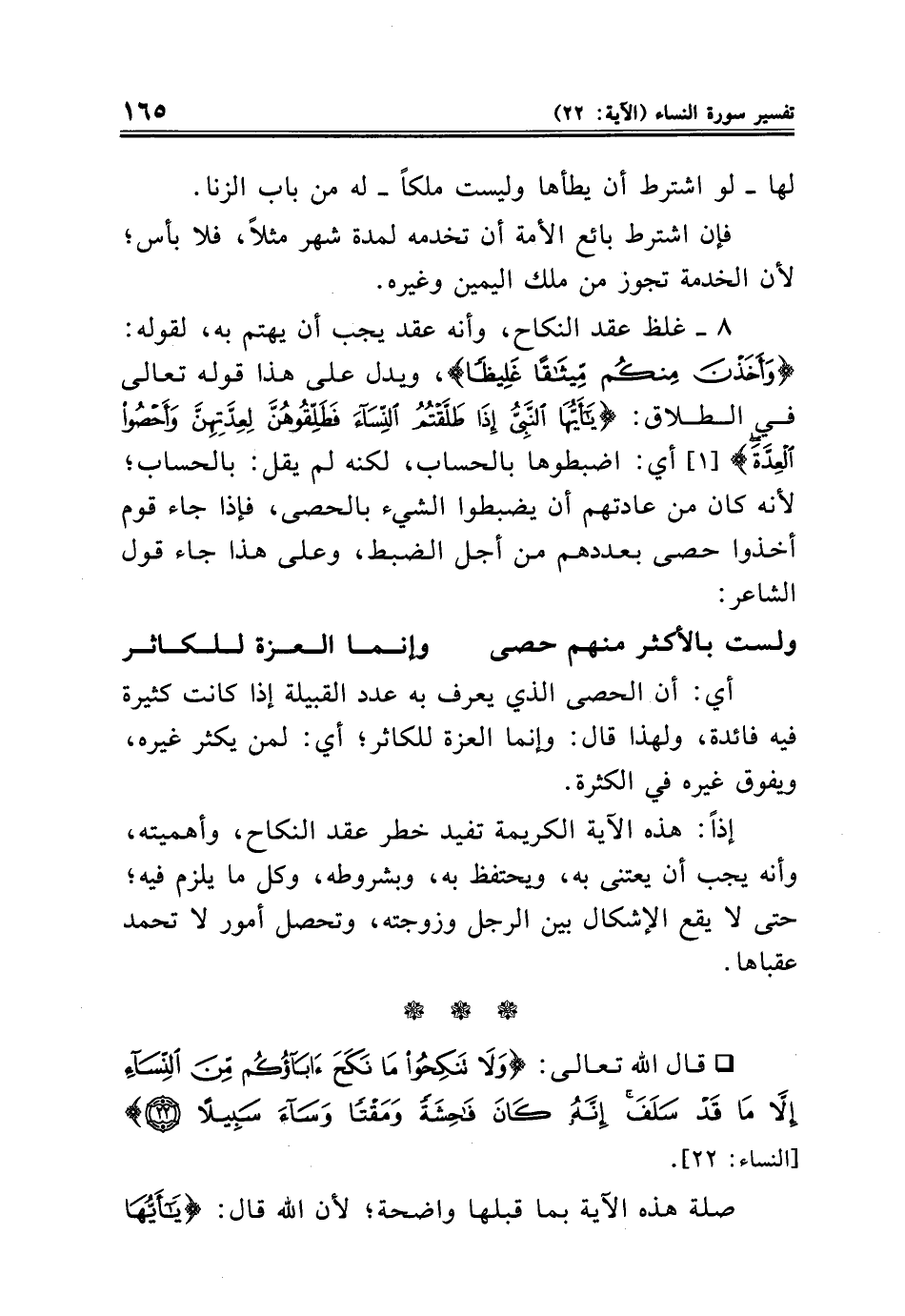 ٨ - غلظ عقد النكاح، وأنه عقد يجب أن يهتم به، لقوله: {وَأَخَذْنَ مِنْكُمْ مِيثَاقًا غَلِيظًا}، ويدل على هذا قوله تعالى في الطلاق: {يَاأَيُّهَا النَّبِيُّ إِذَا طَلَّقْتُمُ النِّسَاءَ فَطَلِّقُوهُنَّ لِعِدَّتِهِنَّ وَأَحْصُوا الْعِدَّةَ} [١] أي: اضبطوها بالحساب، لكنه لم يقل: بالحساب؛ لأنه كان من عادتهم أن يضبطوا الشيء بالحصى، فإذا جاء قوم أخذوا حصى بعددهم من أجل الضبط، وعلى هذا جاء قول الشاعر: