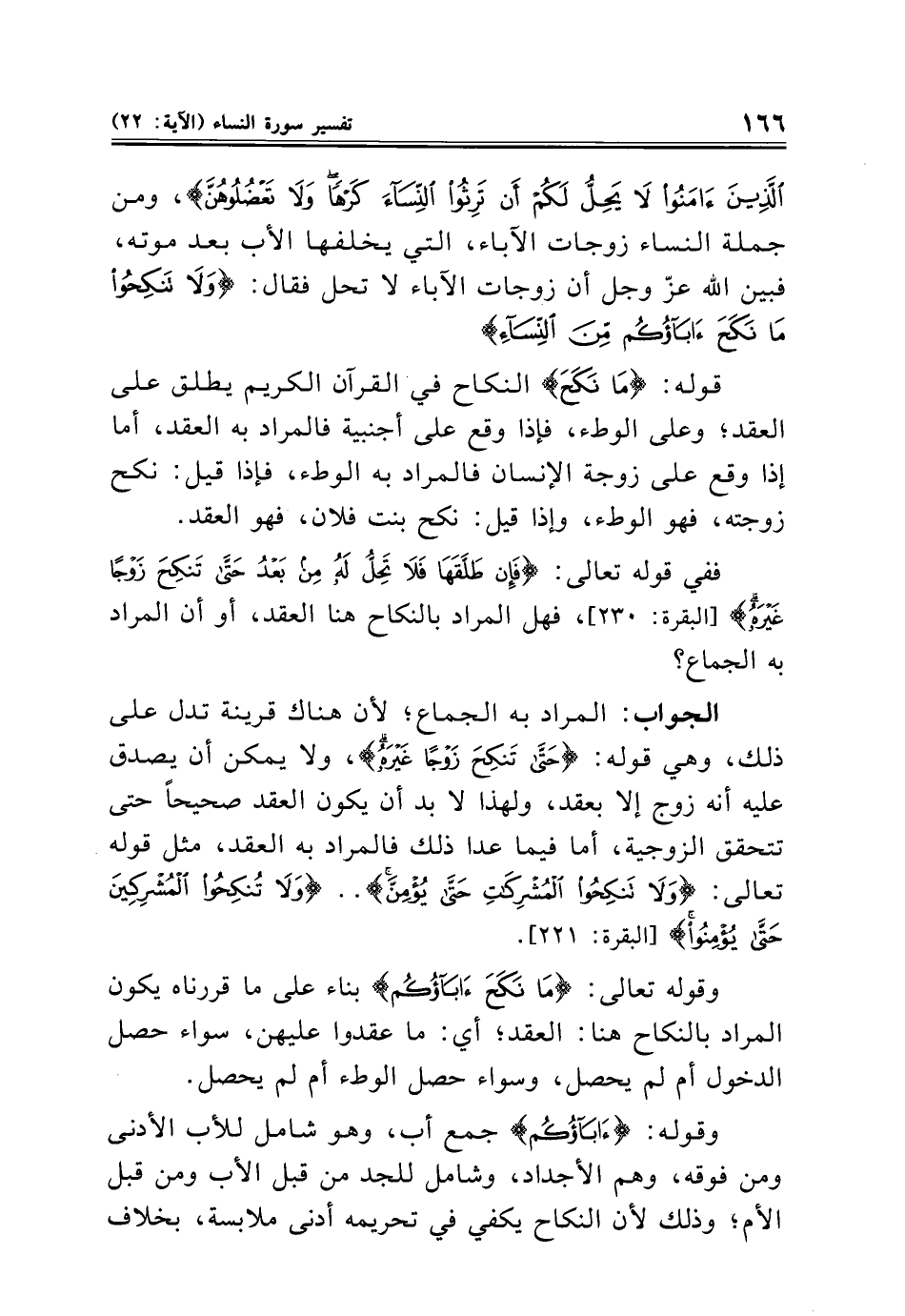 قوله: {مَا نَكَحَ} النكاح في القرآن الكريم يطلق على العقد؛ وعلى الوطء، فإذا وقع على أجنبية فالمراد به العقد، أما إذا وقع على زوجة الإنسان فالمراد به الوطء، فإذا قيل: نكح زوجته، فهو الوطء، وإذا قيل: نكح بنت فلان، فهو العقد.
