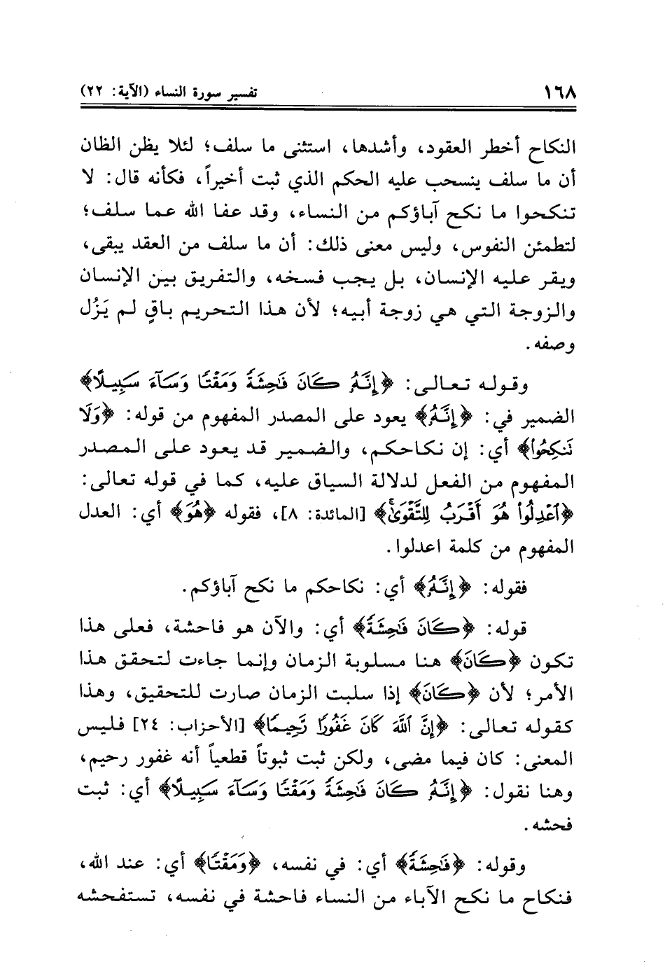 وقوله تعالى: {إِنَّهُ كَانَ فَاحِشَةً وَمَقْتًا وَسَاءَ سَبِيلًا} الضمير في: {إِنَّهُ} يعود على المصدر المفهوم من قوله: {وَلَا تَنْكِحُوا} أي: إن نكاحكم، والضمير قد يعود على المصدر المفهوم من الفعل لدلالة السياق عليه، كما في قوله تعالى: {اعْدِلُوا هُوَ أَقْرَبُ لِلتَّقْوَى} [المائدة: ٨]، فقوله {هُوَ} أي: العدل المفهوم من كلمة اعدلوا.