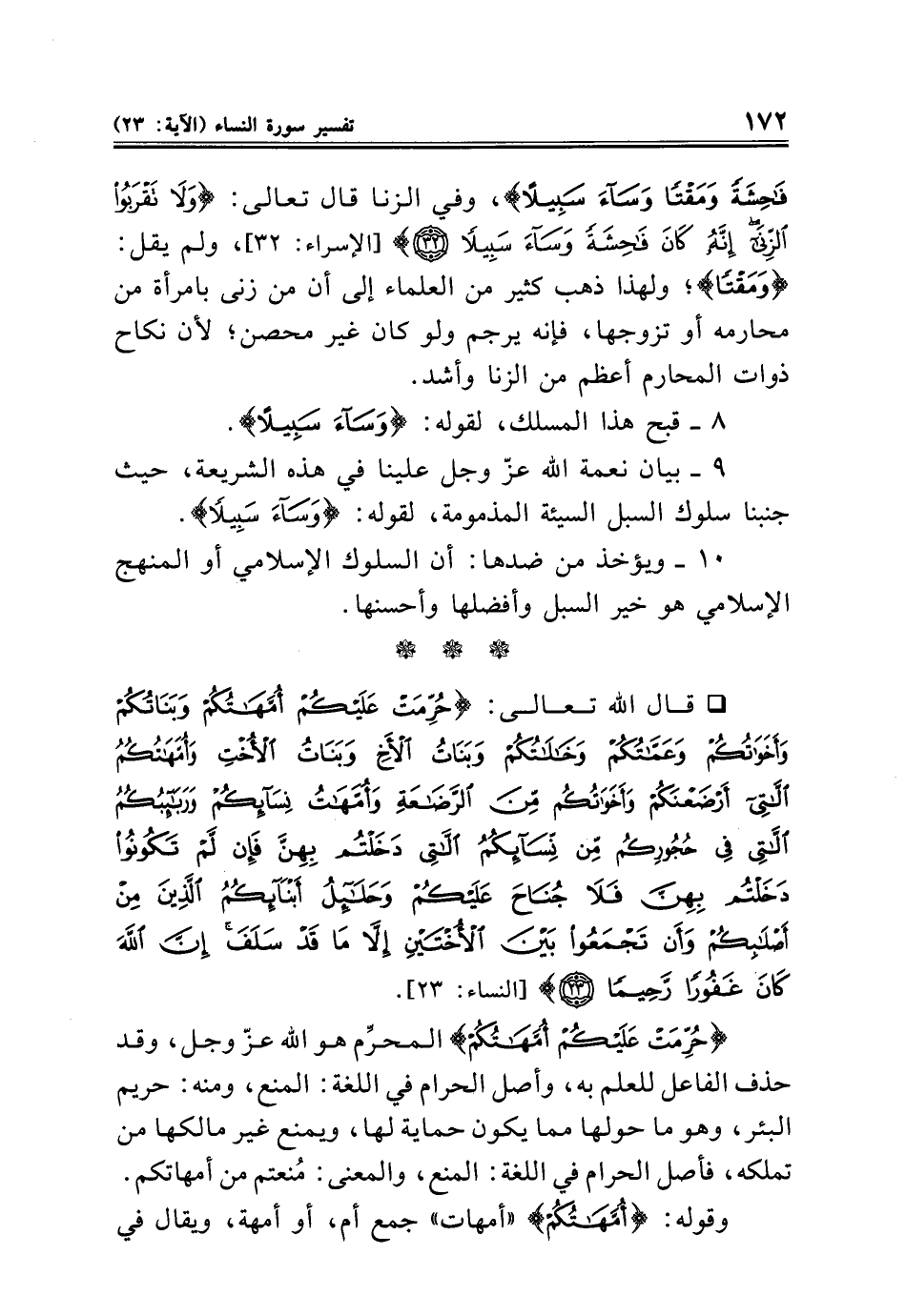 فَاحِشَةً وَمَقْتًا وَسَاءَ سَبِيلًا}، وفي الزنا قال تعالى: {وَلَا تَقْرَبُوا الزِّنَا إِنَّهُ كَانَ فَاحِشَةً وَسَاءَ سَبِيلًا (٣٢)} [الإسراء: ٣٢]، ولم يقل: {وَمَقْتًا}؛ ولهذا ذهب كثير من العلماء إلى أن من زنى بامرأة من محارمه أو تزوجها، فإنه يرجم ولو كان غير محصن؛ لأن نكاح ذوات المحارم أعظم من الزنا وأشد.