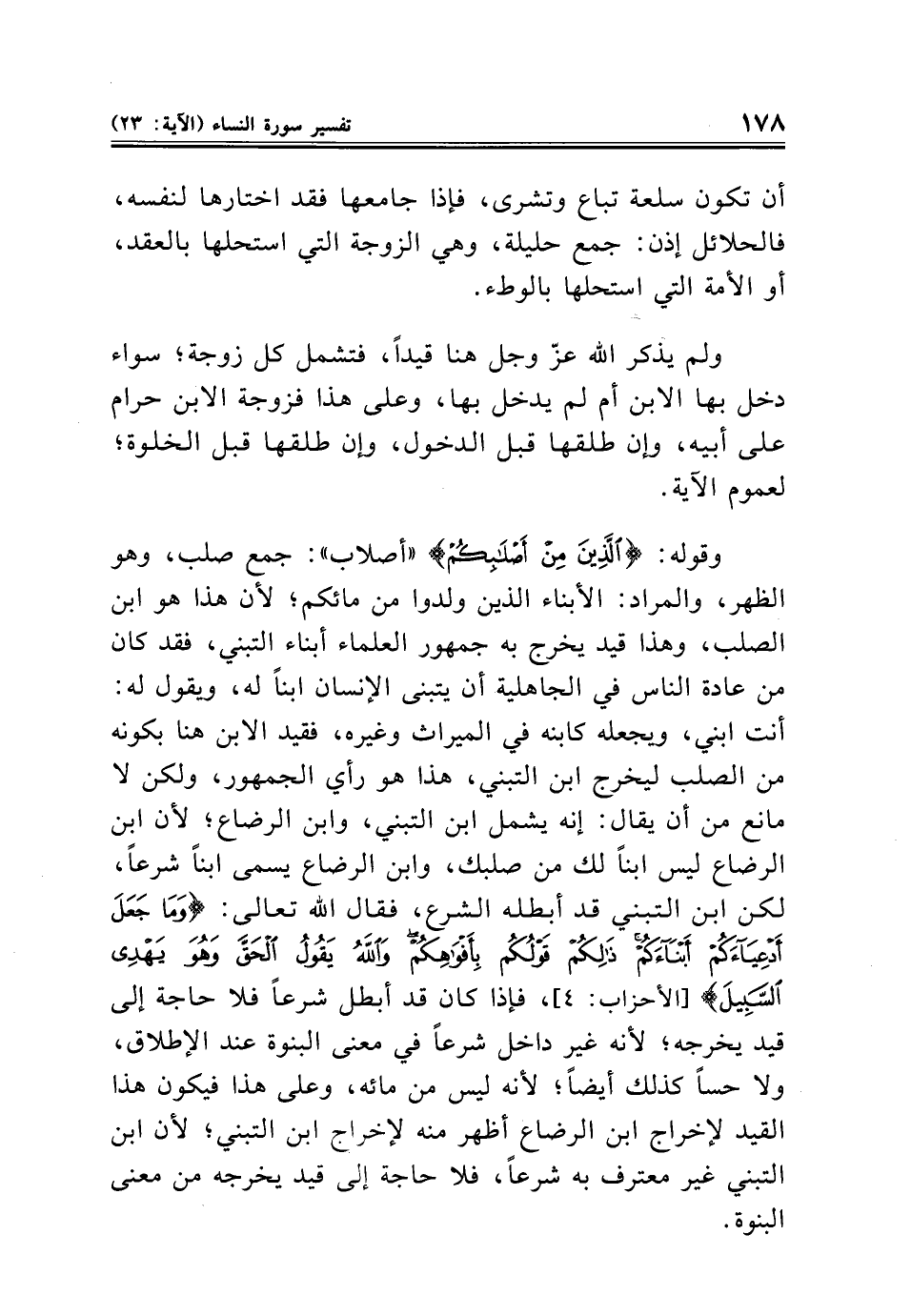 وقوله: {الَّذِينَ مِنْ أَصْلَابِكُمْ} "أصلاب": جمع صلب، وهو الظهر، والمراد: الأبناء الذين ولدوا من مائكم؛ لأن هذا هو ابن الصلب، وهذا قيد يخرج به جمهور العلماء أبناء التبني، فقد كان من عادة الناس في الجاهلية أن يتبنى الإنسان ابنًا له، ويقول له: أنت ابني، ويجعله كابنه في الميراث وغيره، فقيد الإبن هنا بكونه من الصلب ليخرج ابن التبني، هذا هو رأي الجمهور، ولكن لا مانع من أن يقال: إنه يشمل ابن التبني، وابن الرضاع؛ لأن ابن الرضاع ليس ابنًا لك من صلبك، وابن الرضاع يسمى ابنًا شرعًا، لكن ابن التبني قد أبطله الشرع، فقال الله تعالى: {وَمَا جَعَلَ أَدْعِيَاءَكُمْ أَبْنَاءَكُمْ ذَلِكُمْ قَوْلُكُمْ بِأَفْوَاهِكُمْ وَاللَّهُ يَقُولُ الْحَقَّ وَهُوَ يَهْدِي السَّبِيلَ} [الأحزاب: ٤]، فإذا كان قد أبطل شرعًا فلا حاجة إلى قيد يخرجه؛ لأنه غير داخل شرعًا في معنى البنوة عند الإطلاق، ولا حسًا كذلك أيضًا؛ لأنه ليس من مائه، وعلى هذا فيكون هذا القيد لإخراج ابن الرضاع أظهر منه لإخراج ابن التبني؛ لأن ابن التبني غير معترف به شرعًا، فلا حاجة إلى قيد يخرجه من معنى البنوة.