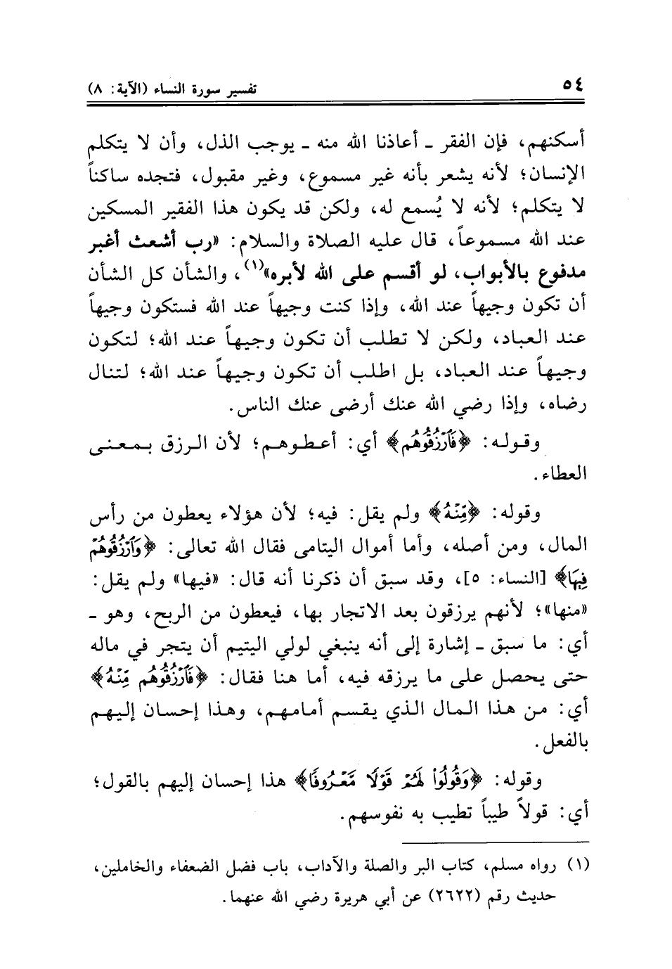 وقوله: {مِنْهُ} ولم يقل: فيه؛ لأن هؤلاء يعطون من رأس المال، ومن أصله، وأما أموال اليتامى فقال الله تعالى: {وَارْزُقُوهُمْ فِيهَا} [النساء: ٥]، وقد سبق أن ذكرنا أنه قال: "فيها" ولم يقل: "منها"؛ لأنهم يرزقون بعد الإتجار بها، فيعطون من الربح، وهو - أي: ما سبق - إشارة إلى أنه ينبغي لولي اليتيم أن يتجر في ماله حتى يحصل على ما يرزقه فيه، أما هنا فقال: {فَارْزُقُوهُمْ مِنْهُ} أي: من هذا المال الذي يقسم أمامهم، وهذا إحسان إليهم بالفعل.