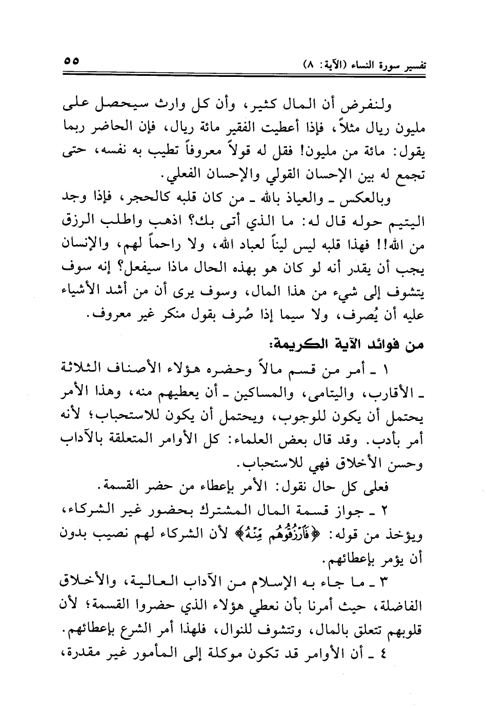 ولنفرض أن المال كثير، وأن كل وارث سيحصل على مليون ريال مثلًا، فإذا أعطيت الفقير مائة ريال، فإن الحاضر ربما يقول: مائة من مليون! فقل له قولًا معروفًا تطيب به نفسه، حتى تجمع له بين الإحسان القولي والإحسان الفعلي.