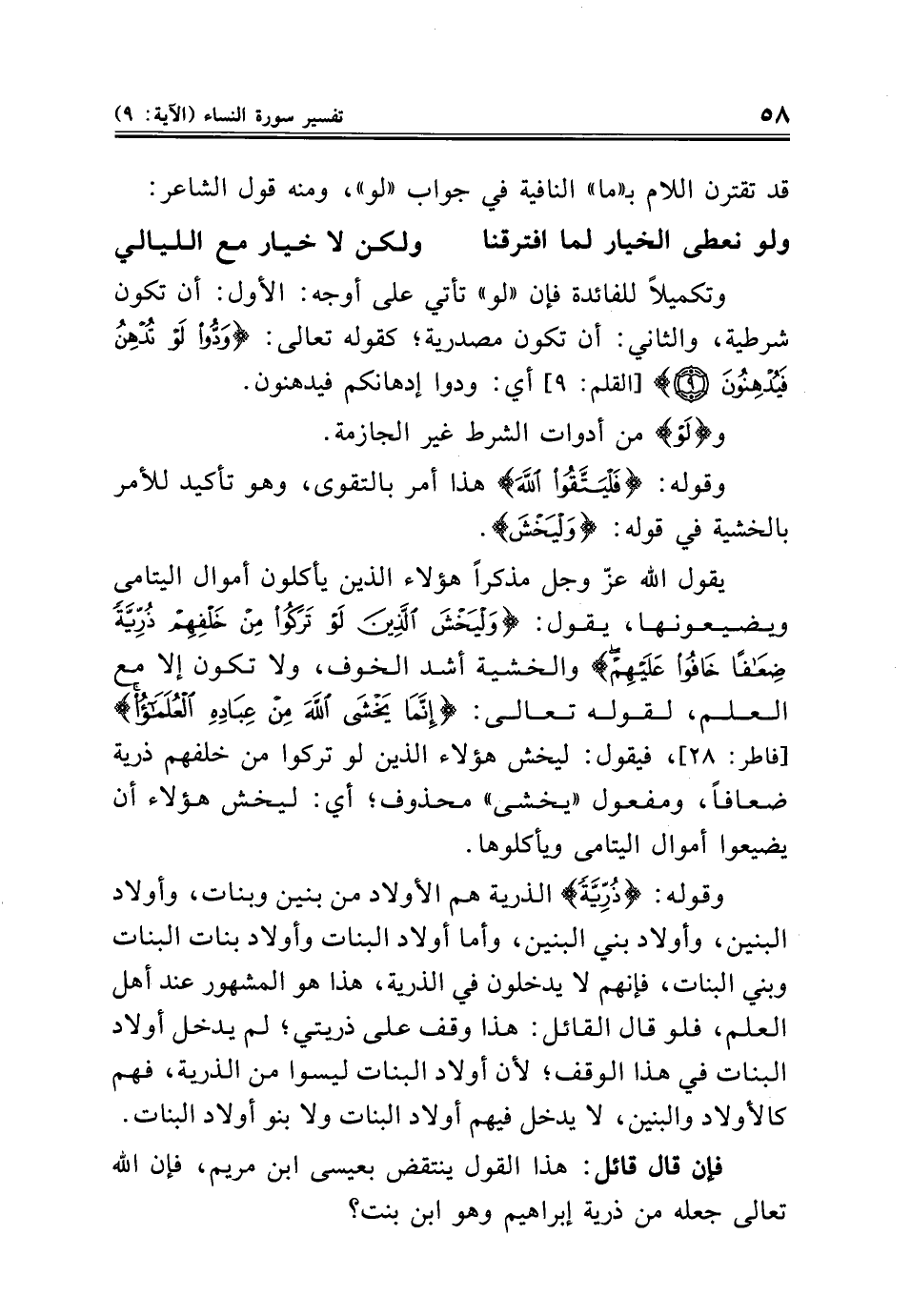 يقول الله عزّ وجل مذكرًا هؤلاء الذين يأكلون أموال اليتامى ويضيعونها، يقول: {وَلْيَخْشَ الَّذِينَ لَوْ تَرَكُوا مِنْ خَلْفِهِمْ ذُرِّيَّةً ضِعَافًا خَافُوا عَلَيْهِمْ} والخشية أشد الخوف، ولا تكون إلا مع العلم، لقوله تعالى: {إِنَّمَا يَخْشَى اللَّهَ مِنْ عِبَادِهِ الْعُلَمَاءُ} [فاطر: ٢٨]، فيقول: ليخش هؤلاء الذين لو تركوا من خلفهم ذرية ضعافًا، ومفعول "يخشى" محذوف؛ أي: ليخش هؤلاء أن يضيعوا أموال اليتامى ويأكلوها.