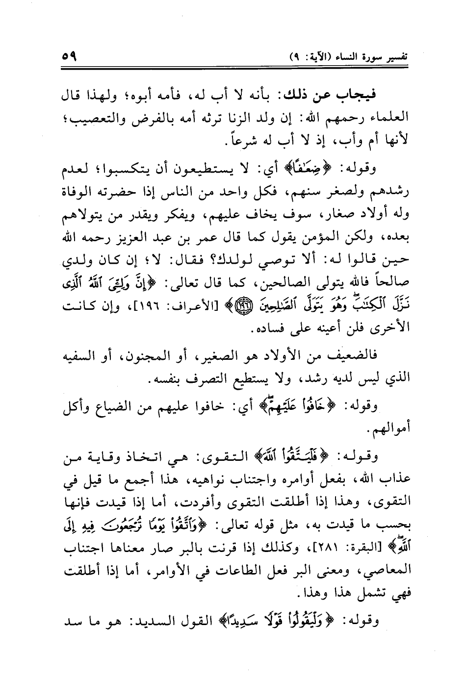 وقوله: {ضِعَافًا} أي: لا يستطيعون أن يتكسبوا؛ لعدم رشدهم ولصغر سنهم، فكل واحد من الناس إذا حضرته الوفاة وله أولاد صغار، سوف يخاف عليهم، ويفكر ويقدر من يتولاهم بعده، ولكن المؤمن يقول كما قال عمر بن عبد العزيز رحمه الله حين قالوا له: ألا توصي لولدك؟ فقال: لا؛ إن كان ولدي صالحًا فالله يتولى الصالحين، كما قال تعالى: {إِنَّ وَلِيِّيَ اللَّهُ الَّذِي نَزَّلَ الْكِتَابَ وَهُوَ يَتَوَلَّى الصَّالِحِينَ (١٩٦)} [الأعراف: ١٩٦]، وإن كانت الأخرى فلن أعينه على فساده.