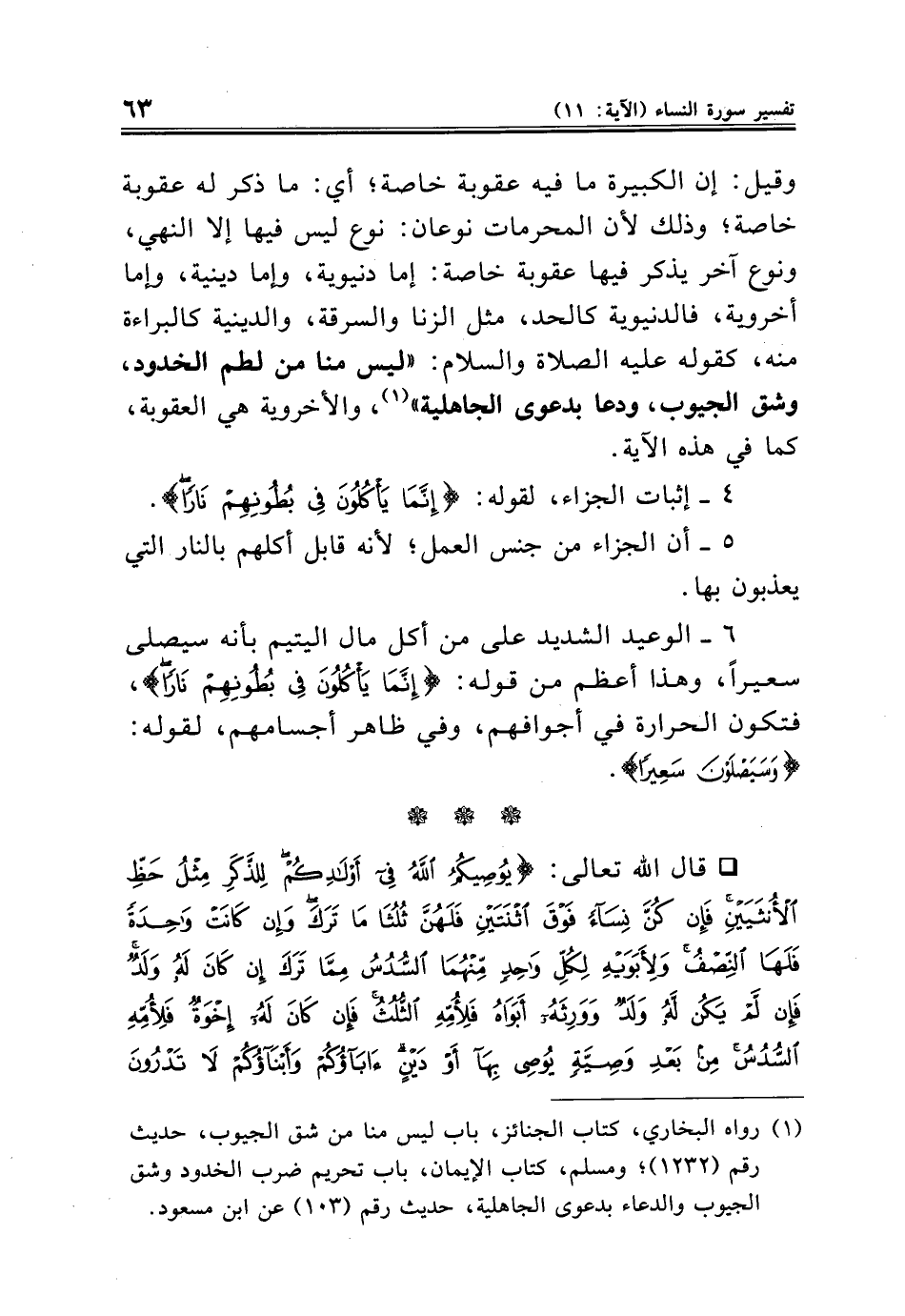 * قال الله تعالى: {يُوصِيكُمُ اللَّهُ فِي أَوْلَادِكُمْ لِلذَّكَرِ مِثْلُ حَظِّ الْأُنْثَيَيْنِ فَإِنْ كُنَّ نِسَاءً فَوْقَ اثْنَتَيْنِ فَلَهُنَّ ثُلُثَا مَا تَرَكَ وَإِنْ كَانَتْ وَاحِدَةً فَلَهَا النِّصْفُ وَلِأَبَوَيْهِ لِكُلِّ وَاحِدٍ مِنْهُمَا السُّدُسُ مِمَّا تَرَكَ إِنْ كَانَ لَهُ وَلَدٌ فَإِنْ لَمْ يَكُنْ لَهُ وَلَدٌ وَوَرِثَهُ أَبَوَاهُ فَلِأُمِّهِ الثُّلُثُ فَإِنْ كَانَ لَهُ إِخْوَةٌ فَلِأُمِّهِ السُّدُسُ مِنْ بَعْدِ وَصِيَّةٍ يُوصِي بِهَا أَوْ دَيْنٍ آبَاؤُكُمْ وَأَبْنَاؤُكُمْ لَا تَدْرُونَ