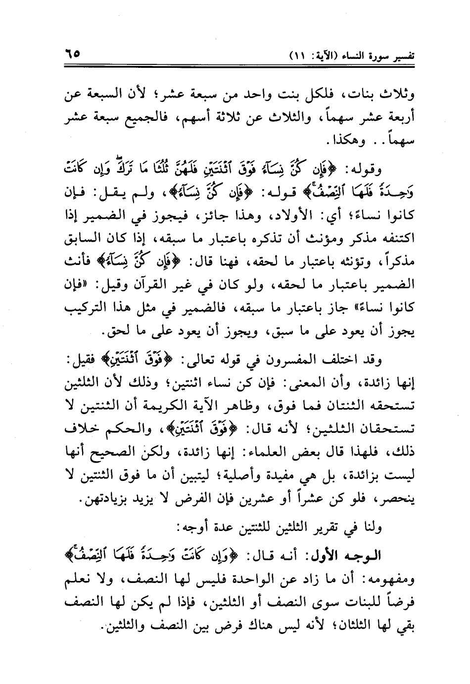 وقوله: {فَإِنْ كُنَّ نِسَاءً فَوْقَ اثْنَتَيْنِ فَلَهُنَّ ثُلُثَا مَا تَرَكَ وَإِنْ كَانَتْ وَاحِدَةً فَلَهَا النِّصْفُ} قوله: {فَإِنْ كُنَّ نِسَاءً}، ولم يقل: فإن كانوا نساءً؛ أي: الأولاد، وهذا جائز، فيجوز في الضمير إذا اكتنفه مذكر ومؤنث أن تذكره باعتبار ما سبقه، إذا كان السابق مذكرًا، وتؤنثه باعتبار ما لحقه، فهنا قال: {فَإِنْ كُنَّ نِسَاءً} فأنث الضمير باعتبار ما لحقه، ولو كان في غير القرآن وقيل: "فإن كانوا نساءً" جاز باعتبار ما سبقه، فالضمير في مثل هذا التركيب يجوز أن يعود على ما سبق، ويجوز أن يعود على ما لحق.