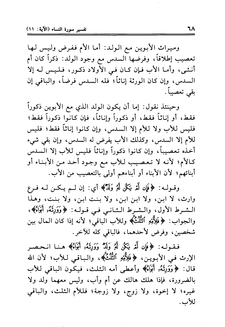 فقوله: {فَإِنْ لَمْ يَكُنْ لَهُ وَلَدٌ وَوَرِثَهُ أَبَوَاهُ} هنا انحصر الإرث في الأبوين، {فَلِأُمِّهِ الثُّلُثُ}، والباقي للأب؛ لأن الله قال: {وَوَرِثَهُ أَبَوَاهُ} وأعطى أمه الثلث، فيكون الباقي للأب بالضرورة، فإذا هلك هالك عن أم وأب، وليس معهما ولد ولا غيره؛ لا إخوة، ولا زوج، ولا زوجة؛ فللأم الثلث، والباقي للأب.