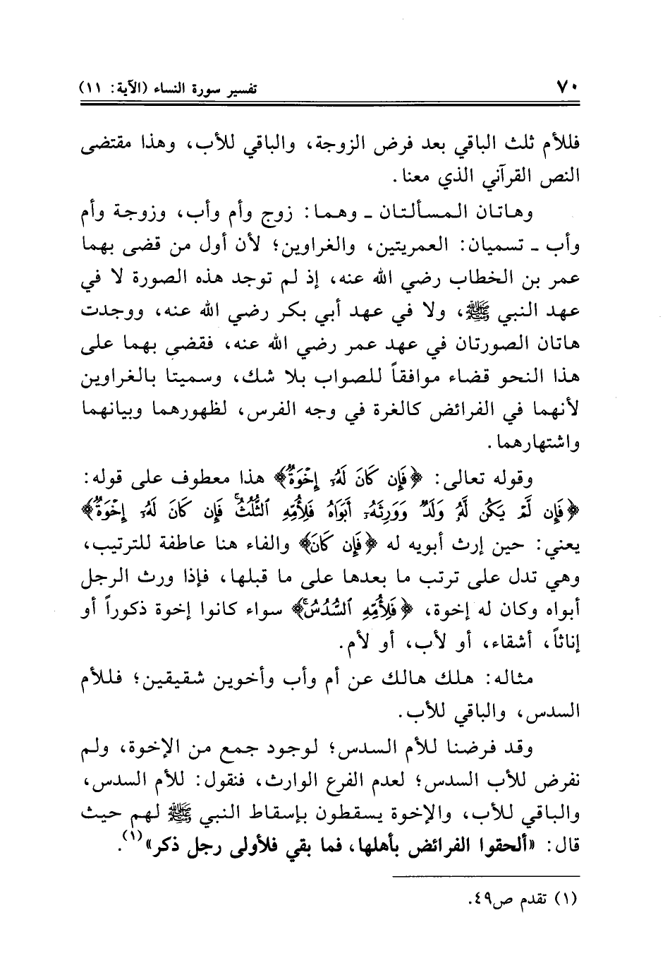 وقد فرضنا للأم السدس؛ لوجود جمع من الإخوة، ولم نفرض للأب السدس؛ لعدم الفرع الوارث، فنقول: للأم السدس، والباقي للأب، والإخوة يسقطون بإسقاط النبي - صلى الله عليه وسلم - لهم حيث قال: "ألحقوا الفرائض بأهلها، فما بقي فلأولى رجل ذكر" (¬١).