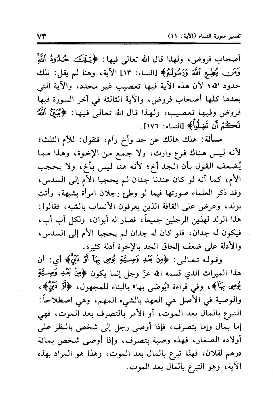 أصحاب فروض، ولهذا قال الله تعالى فيها: {تِلْكَ حُدُودُ اللَّهِ وَمَنْ يُطِعِ اللَّهَ وَرَسُولَهُ} [النساء: ١٣] الآية، وهنا لم يقل: تلك حدود الله؛ لأن هذه الآية فيها تعصيب غير محدد، والآية التي بعدها كلها أصحاب فروض، والآية الثالثة في آخر السورة فيها فروض وفيها تعصيب، ولهذا قال الله تعالى فيها: {يُبَيِّنُ اللَّهُ لَكُمْ أَنْ تَضِلُّوا} [النساء: ١٧٦].