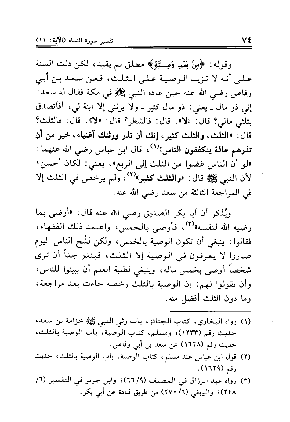 (¬٢) قول ابن عباس عند مسلم، كتاب الوصية، باب الوصية بالثلث، حديث رقم (١٦٢٩).
