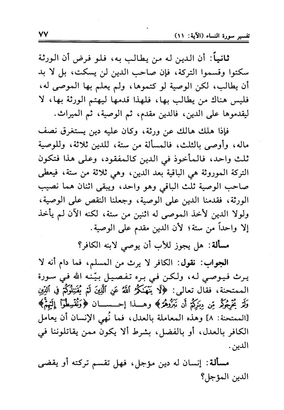 ثانيًا: أن الدين له من يطالب به، فلو فرض أن الورثة سكتوا وقسموا التركة، فإن صاحب الدين لن يسكت، بل لا بد أن يطالب، لكن الوصية لو كتموها، ولم يعلم بها الموصى له، فليس هناك من يطالب بها، فلهذا قدمها ليهتم الورثة بها، لا ليقدموها على الدين، فالدين مقدم، ثم الوصية، ثم الميراث.