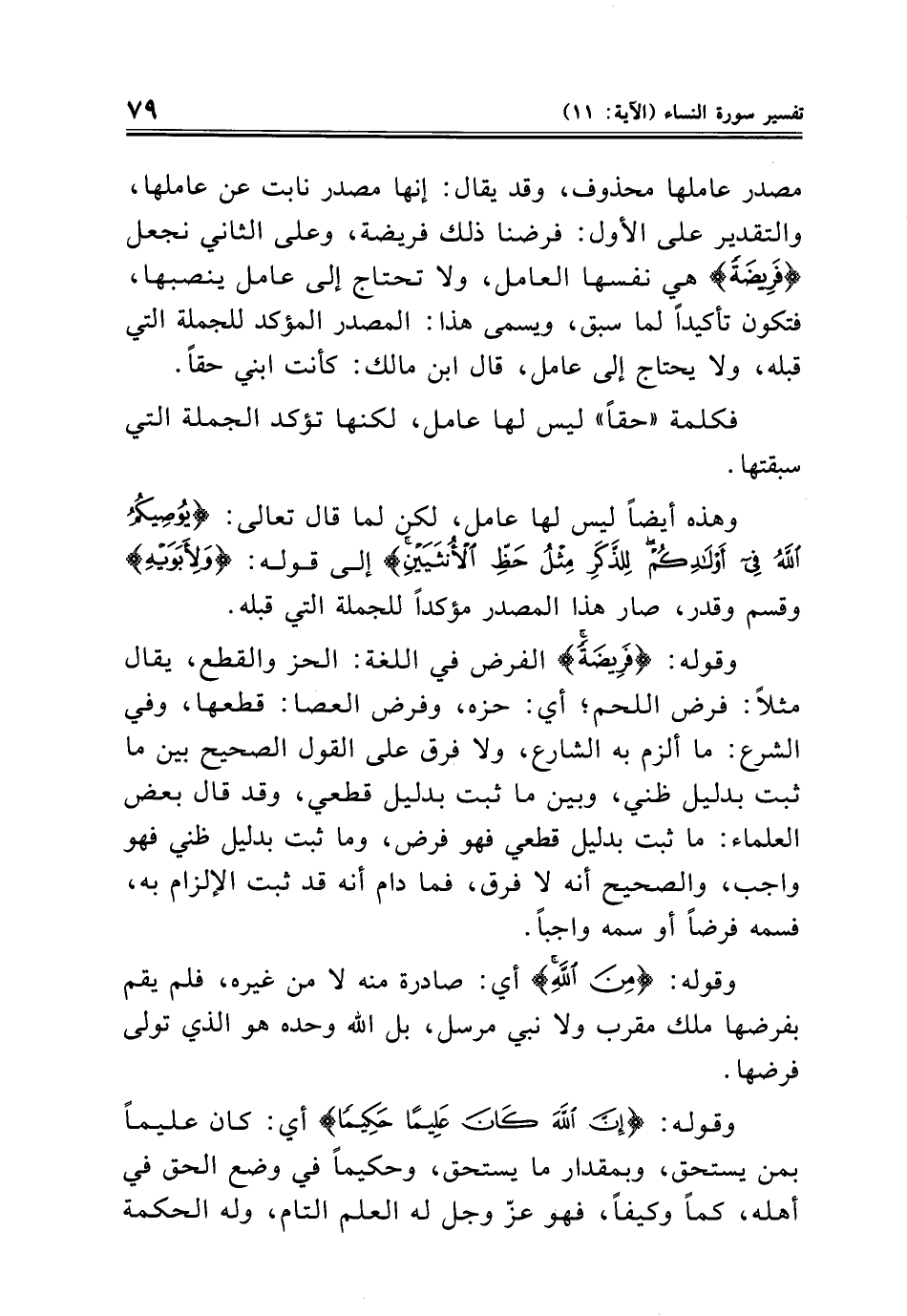 مصدر عاملها محذوف، وقد يقال: إنها مصدر نابت عن عاملها، والتقدير على الأول: فرضنا ذلك فريضة، وعلى الثاني نجعل {فَرِيضَةً} هي نفسها العامل، ولا تحتاج إلى عامل ينصبها، فتكون تأكيدًا لما سبق، ويسمى هذا: المصدر المؤكد للجملة التي قبله، ولا يحتاج إلى عامل، قال ابن مالك: كأنت ابني حقًا.