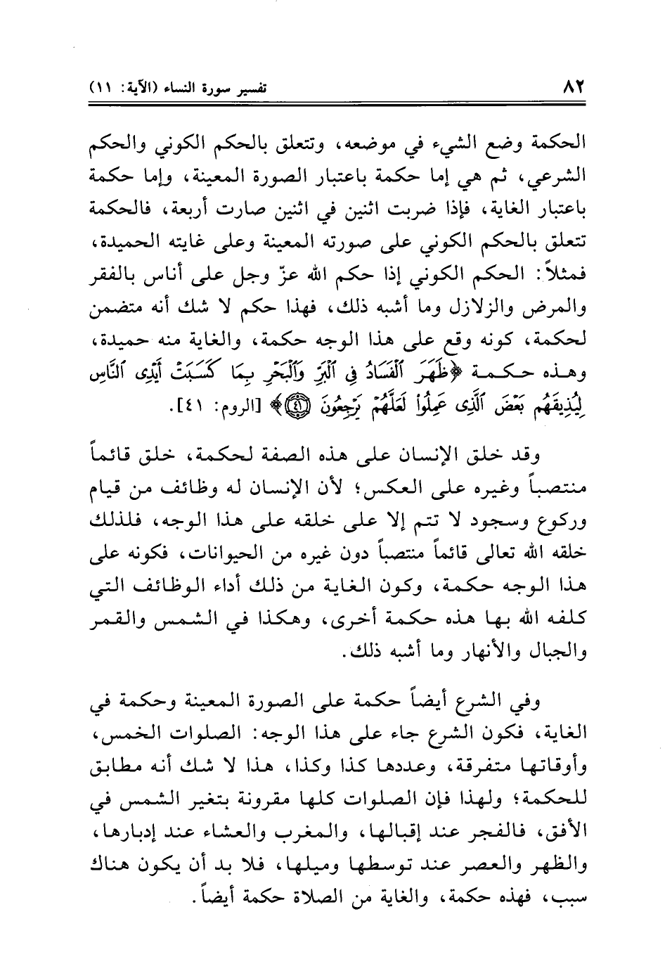وفي الشرع أيضًا حكمة على الصورة المعينة وحكمة في الغاية، فكون الشرع جاء على هذا الوجه: الصلوات الخمس، وأوقاتها متفرقة، وعددها كذا وكذا، هذا لا شك أنه مطابق للحكمة؛ ولهذا فإن الصلوات كلها مقرونة بتغير الشمس في الأفق، فالفجر عند إقبالها، والمغرب والعشاء عند إدبارها، والظهر والعصر عند توسطها وميلها، فلا بد أن يكون هناك سبب، فهذه حكمة، والغاية من الصلاة حكمة أيضًا.