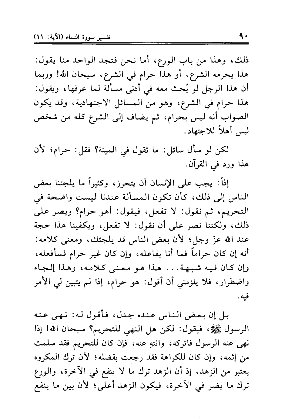 ذلك، وهذا من باب الورع، أما نحن فتجد الواحد منا يقول: هذا يحرمه الشرع، أو هذا حرام في الشرع، سبحان الله! وربما أن هذا الرجل لو بُحث معه في أدنى مسألة لما عرفها، ويقول: هذا حرام في الشرع، وهو من المسائل الإجتهادية، وقد يكون الصواب أنه ليس بحرام، ثم يضاف إلى الشرع كله من شخص ليس أهلًا للإجتهاد.